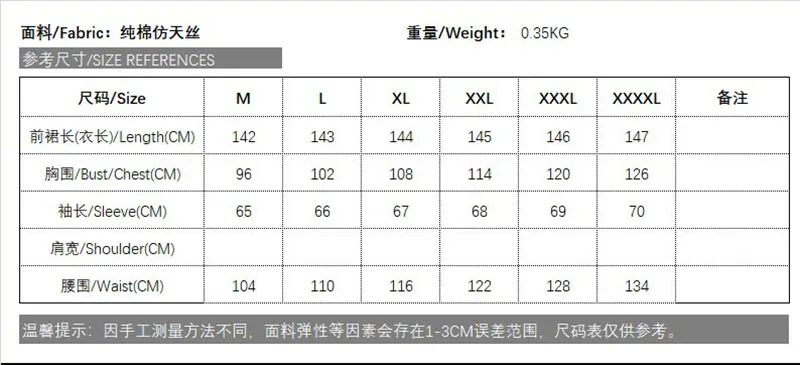 M: обхват груди: 96 см, длина: 142 см, длина рукава: 65 см, обхват талии: 104 см, L: обхват груди: 102 см, длина: 143 см, длина рукава: 66 см, обхват талии: 110 см, XL: обхват груди: 108 см, длина: 144 см, длина рукава: 67 см, обхват талии: 116 см, 2XL: обхват груди: 114 см, длина: 145 см, длина рукава: 68 см, обхват талии: 122 см, 3XL: обхват груди: 120 см, длина: 146 см, рукав; 69 см, обхват талии: 128 см, 4XL: обхват груди: 126 см, длина: 147 см, длина рукава: 70 см, обхват талии: 134 см, Размер: наш продукт имеет Азиатский Размер, а не размер ЕС/США, мы рекомендуем вам выбрать размер на 2 больше при размещении заказа. Все размеры указаны в таблице размеров 2-4 см, допускается погрешность в данных. Если вы не знаете, как выбрать размер, пожалуйста, свяжитесь с нами, спасибо! Цвет: (обратите внимание, что из-за ограничений в фотографии и необходимых различий в настройках мониторов Цвет s, изображенный на фотографии, может не на 100% совпадать с самим товаром.)