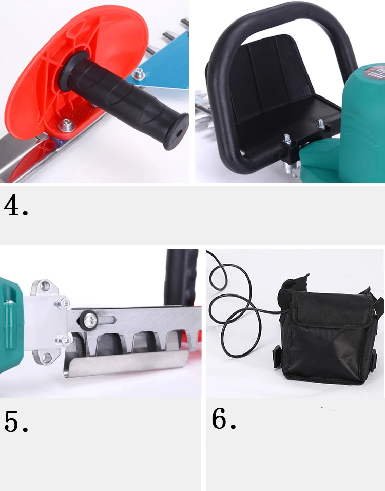 1.Лезвие с одной окантовкойВыбор высококачественного и прочного импорта лезвийСтальные материалы, чем больше используется, тем острее2.Лезвие с двумя краямиУтолщенные и расширенные лезвия, профессионально обрезаны большими ветками и листьями, более износостойкие и острые.3.Двигатель мощный, стабильная мощностьБыстрое реагирование,Несколько вентиляционных отверстийМожет поддерживать длительную работу охлаждения.4.Ручной эргономичный дизайн, особенно утолщенные роскошные ручки,Чувствуйте себя комфортно, легко и без усилий, Управляйте свободно и мощнее.5.Дефлектор безопасностиУстановите перегородку в конце ножа, чтобы предотвратить случайную резку руки во время работы.6.Зарядный рюкзакПортативный Рюкзак-батарея, используя 24VАккумулятор может работать в течение длительного времени и может работать от 5 до 6 часов при одной зарядке.