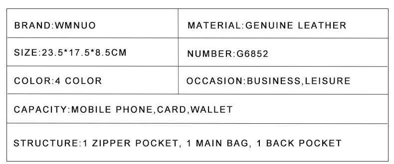 Название продукта: сумка бренда Wmnuo Женская сумка через плечо 100% натуральная кожа мягкая сумка на плечо с надписью для дам вечерние сумки на молнии известный хит продаж Материал: Высококачественная натуральная коровья кожа Размер: 23,5*17,5*8,5 см Вместимость: мобильный телефон, карта, кошелек, косметика Структура: мобильный телефон сумка, карман на молнии, Основная сумка Цвет: как на фото Примечание. 1. Из-за различных методов измерения допускается погрешность в 1-3 см.(1 дюйм = 2,54 см; 1 см = 0,39 дюйма) 2. Из-за различных настроек мониторов цвет изображения может немного отличаться от фактического цвета продукта.