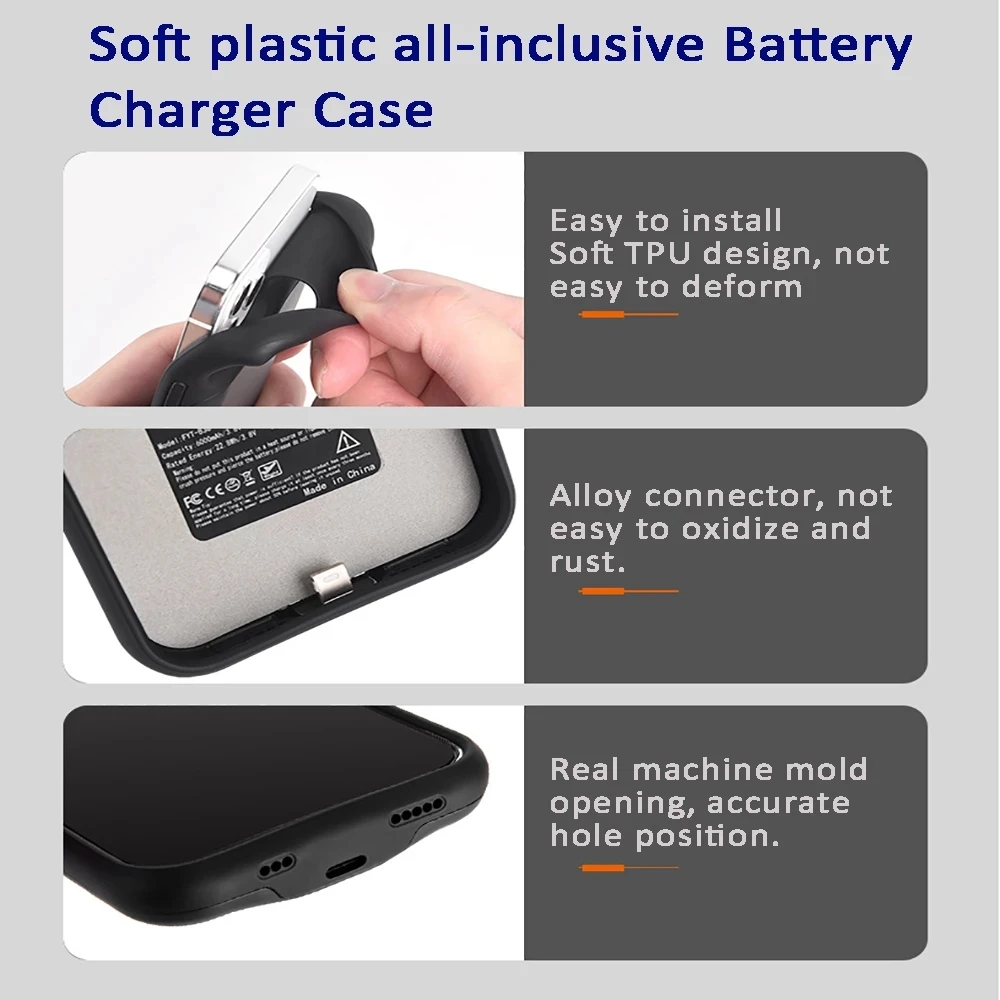 Спецификация: -Тип изделия: чехол для зарядного устройства 1-для iPhone 11 6000 мАч 2-для iPhone 11 Pro Max 6000 мАч 3-для iPhone 11 Pro 5000 мАч -Тип батареи: литий-ионный полимерный аккумулятор -Материал: высококачественный пластик + силикон Комплексная защита