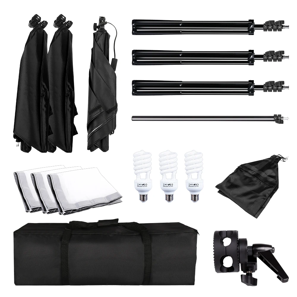 Это идеальный набор софтбоксов для цифрового фото-и видеосъемки. Лампа для фотографирования, Цоколь E27 подходит для большинства осветительных приборов. 2 шт 60x60 см софтбокс и 1 шт 40x40 см софтбокс: белая Складная мягкая ткань, Высококачественная Светоотражающая частица. Серебристый внутренняя уход за кожей лица, чтобы свести к минимуму светильник потери и максимизировать светильник распространения. Безопасный и нетоксичный полиэфирное волокно, 4 гибкий шатуны. 45 Вт светильник дневного света: Дневной светильник сбалансированный, 5500K лампа обеспечивает истинные и точные цвета для большинства видео и фотостудий. Светильник: высота в сложенном виде 27 дюймов (68 см), рабочая высота 79 дюймов (200 см). Высокое качество, стабильный и прочный, прост в установке и использовании. 75-140 см регулируемая консольная стойка + поворотный зажим + песочный мешок: дать вам гораздо более широкий спектр выбора положения; Помочь вам найти идеальное место освещения. Сумка Оксфорд: может содержать все детали продукта, легко носить с собой.