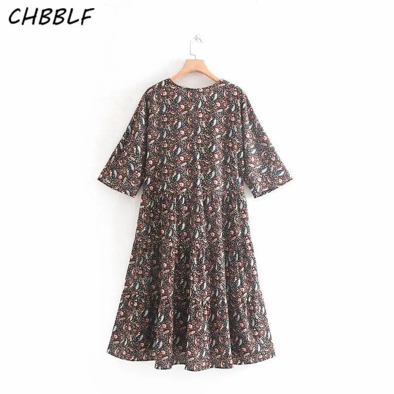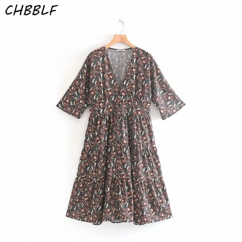 CHBBLF женское ретро платье-миди с узором пейсли v-образный вырез короткий рукав - купить