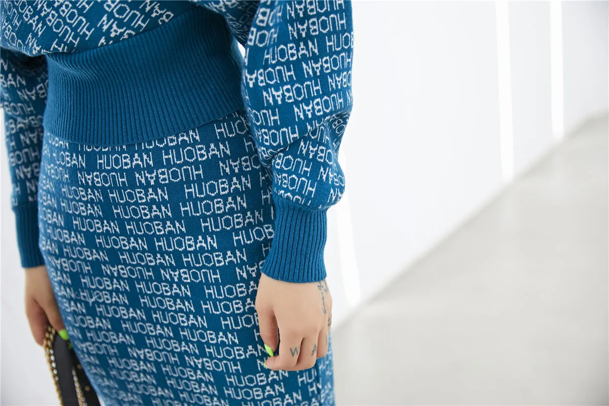 CHEERART Two Piece Sweater Skirt Set V Neck Backless Letter Print Japanese Blue Crop Top Winter Woman Outfit 2019 - купить