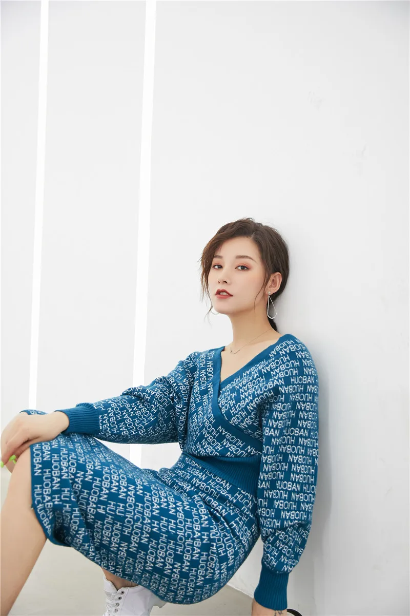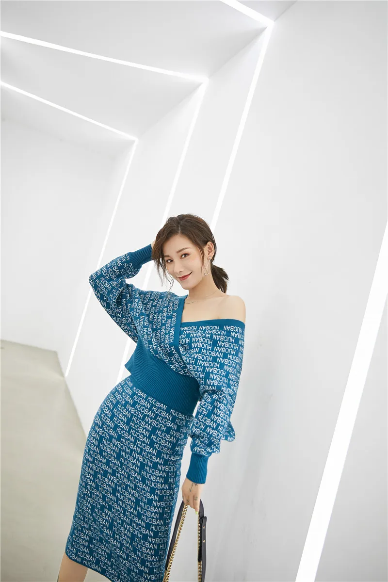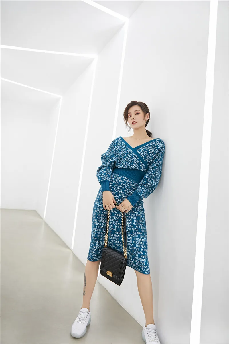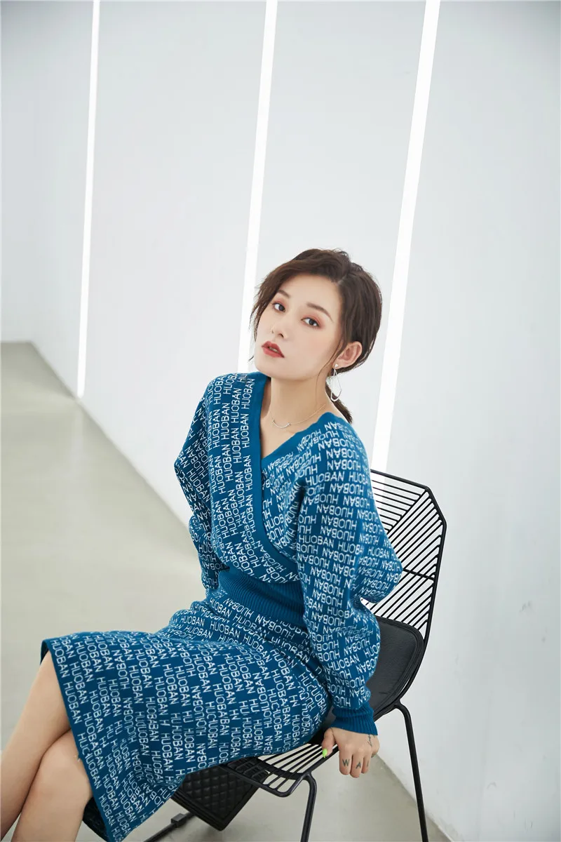 Купить CHEERART Two Piece Sweater Skirt Set V Neck Backless Letter Print Japanese Blue Crop Top Winter Woman Outfit 2019 |