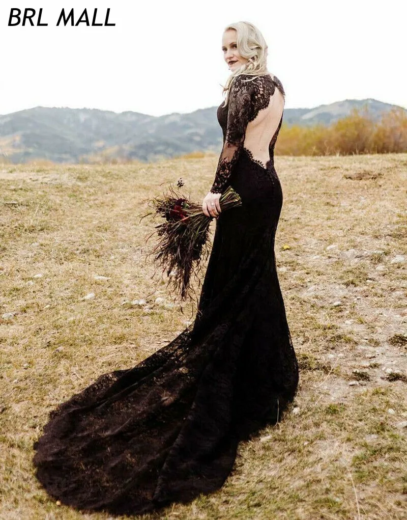 Купить Богемное черное кружевное свадебное платье с длинными рукавами русалочкой 2020