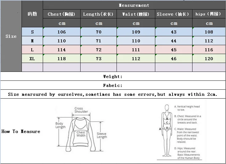 About the Size: The size system of different clothes is different.Please compare the detail sizes with your similar Clothing before you buy!If you need detailed size tables Or have any questions, please contact us. Women's experience Size Chart Unit:cm /1(inch)=2.54(cm) 1kg=2.2 lb One size:In general, Suggest Weight 47-60(kg) /Suggest Height 156-168(cm)