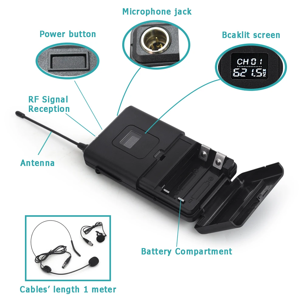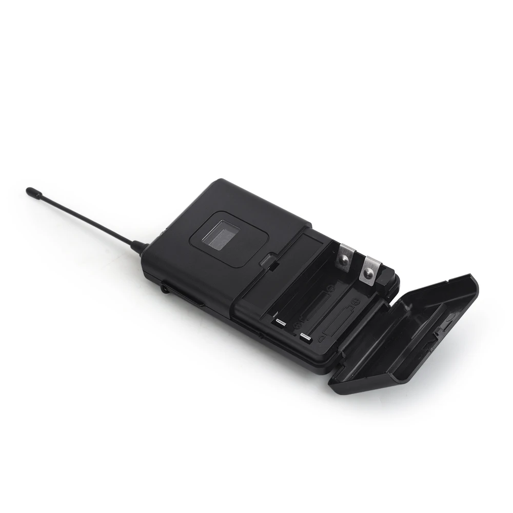 1. Высококачественная антенна 2. Светильник приема радиочастотного сигнала 3. Материал: пластиковый передатчик 4. Батарея отсек: 2*1,5 V AA Батарея в соответствии со спросом (не прилагаются) 5. Разъем микрофона: Мини 3-контактный разъем XLR 6. Мощность: сенсорный переключатель 7. Экран: HD экран с подсветкой (не может меняться) 8. Длина кабеля гарнитуры и отворота микрофона: 1 метр