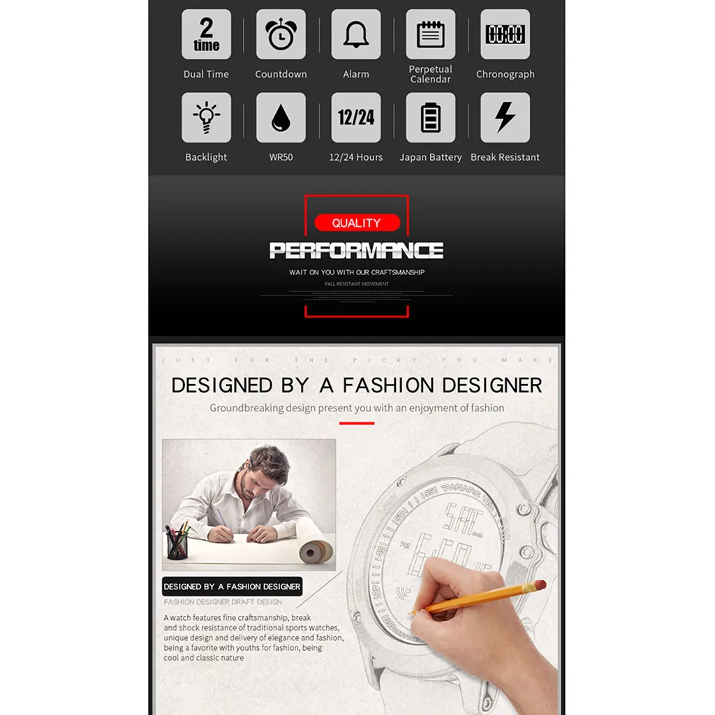 Вакуумный тест воды 50 метров Плавательный водонепроницаемый, гладкий ремень, удобно носить Функция: Двойное время, Вечный календарь (еженедельная Автоматическая передача), обратный отсчет, таймер тревоги, Секундомер, светящийся, 12/24 часовая система. Водонепроницаемый: 50 метров Водонепроницаемость для плавания, каждый Вакуумный тест воды. Легко подходит ко всему Лучший подарок для папы, Boyfriend.Описание: