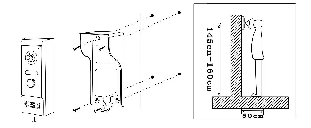 Стандартная высота для установки наружного устройства составляет 145 см ~ 160 см (расстояние от наружной камеры до пола). Убедитесь, что объектив камеры не указывает непосредственно на солнце или на отражающую поверхность.