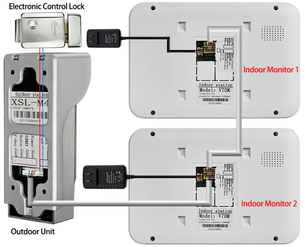Речь идет о 4-проводной системы, используйте 4-х ядерный кабель для подключения камеры к монитору, используйте 4-х ядерный кабель для подключения монитора к следующему монитора. (Обратите внимание, что замки, источник питания и кнопка выхода на фото ниже не включены, если вам нужно, пожалуйста, свяжитесь с нами)