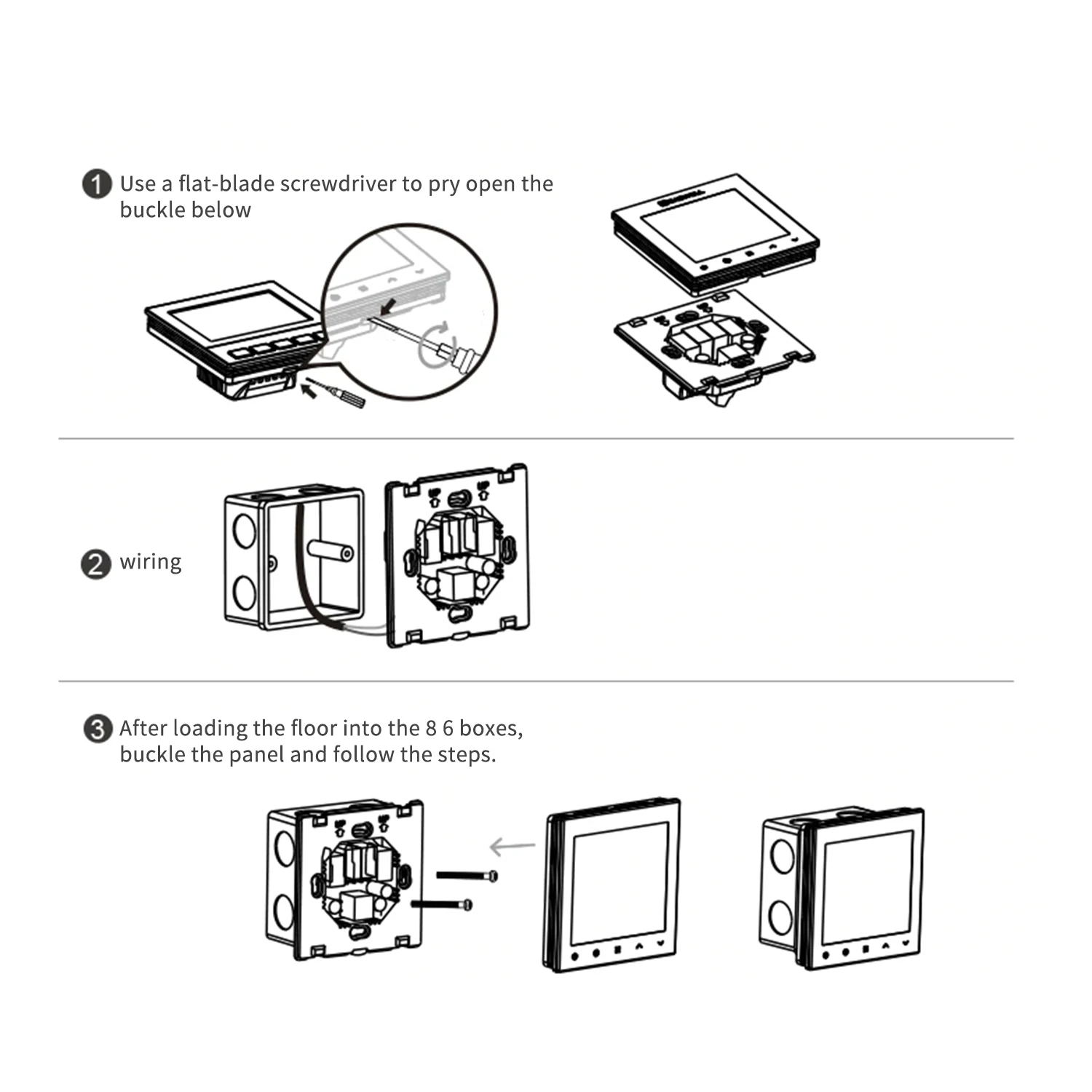 1. Перед установкой, удалением, очисткой или обслуживанием термостата, всегда выключайте питание от основного источника питания, откручивая предохранитель переключателя выключателя на выключенное положение.