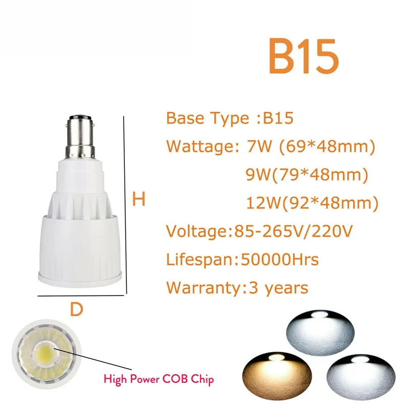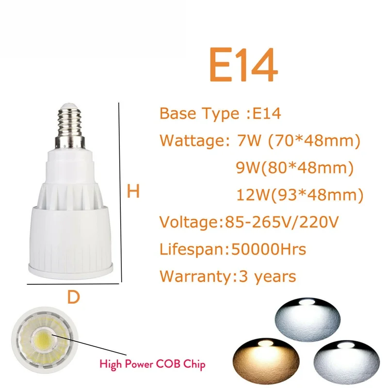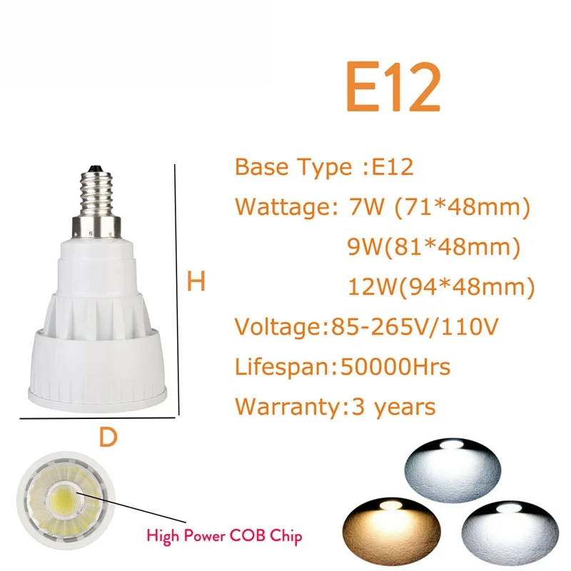 Тип: светодиодный прожектор Тип цоколя: E12 / E14 / E27 / B22 / GU10 / GU5.3 / MR16 / B15 Ультратонкое естественное освещение CRI> 80 Гарантия: 3 года 7 Вт (эквивалент 30 Вт накаливания) 9 Вт (эквивалент 50 Вт накаливания); 12 Вт (эквивалент 70 Вт накаливания)