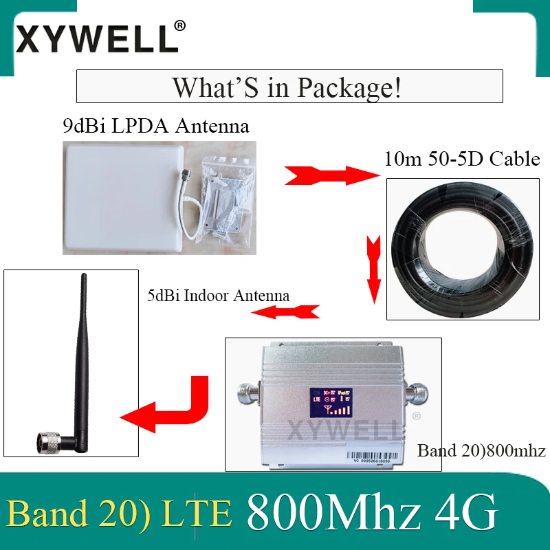 ЖК-дисплей! 4G LTE 800MHz 4G мобильный телефон усилитель сигнала + Внутренняя всенаправленная антенна + 9dBi наружная панельная антенна + Кабель 10 метров + Адаптер питания 5 в постоянного тока