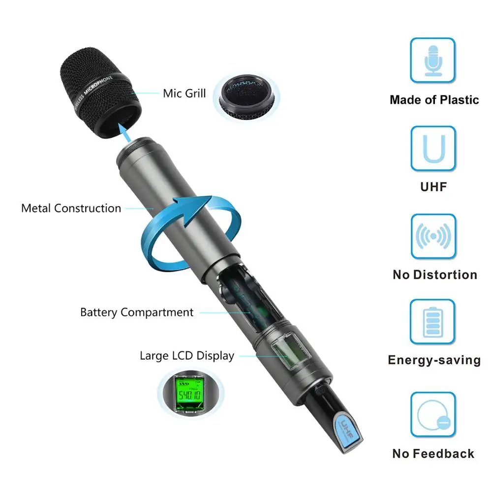 4. Сценический беспроводной микрофон не только позволяет использовать конференции и другие места (мощные пуски) беспрепятственно, но и гладко в школьных классах, комнатах KTV (низкомощная передача) И так далее. Быстрая установка, простое подключение, легко играть, надежные сигналы и не беспокойтесь будут отключены во время использования, работает до 260 Ft.