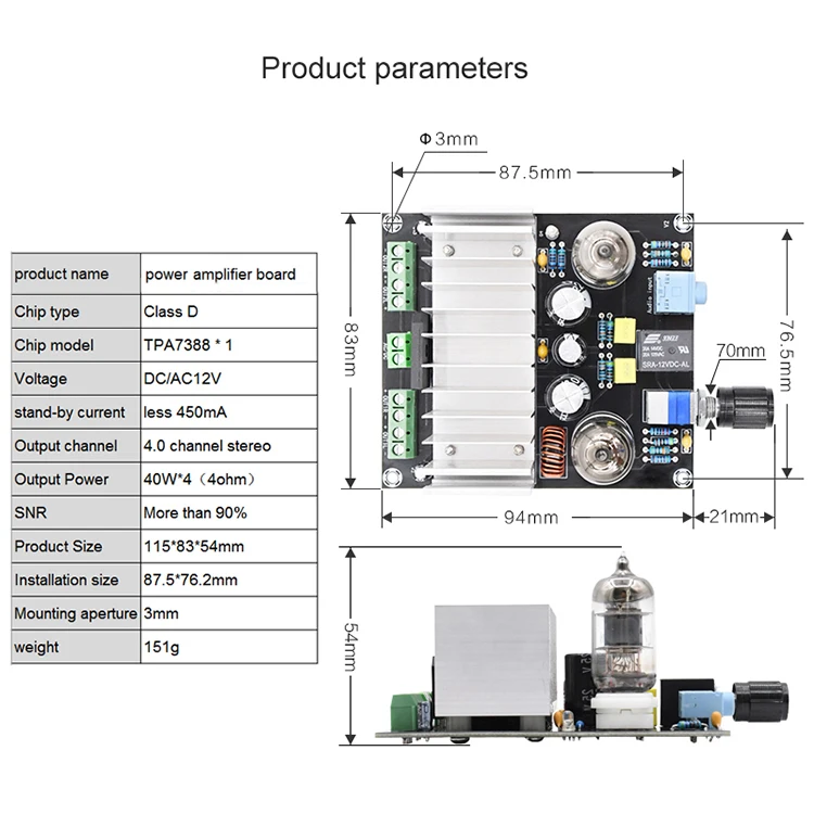 Название продукта цифровая плата усилителя мощности Тип чипа класса D Чип Модель TPA7388 * 1 Напряжение постоянного тока/AC12V Ток менее 450мА Выходной канал 4,0 Канал Стерео Выходная мощность 40 Вт * 4(4 Ом) Коэффициент "сигнал/шум" более 90% Размер изделия 115*83*54 мм Размер установки 87,5*76,2 мм Монтажная Диафрагма 3 мм Вес 151 г
