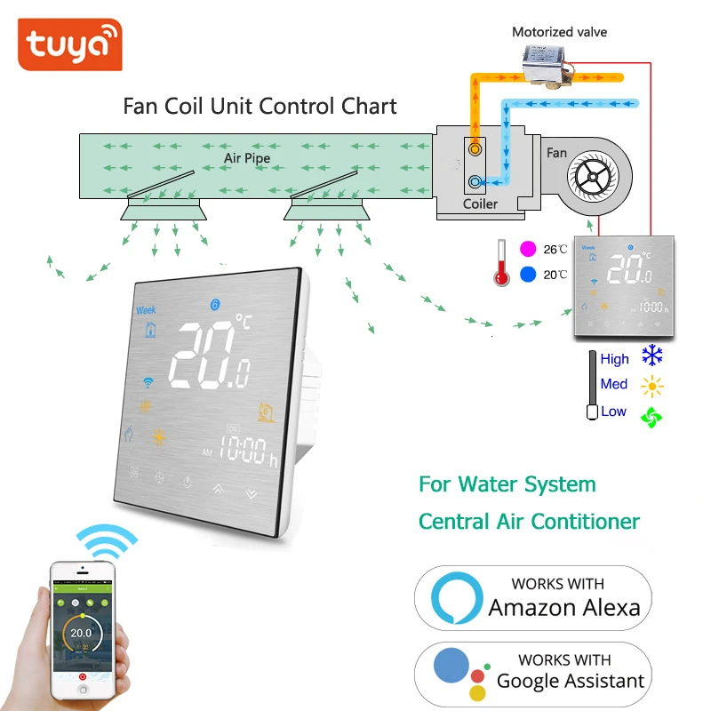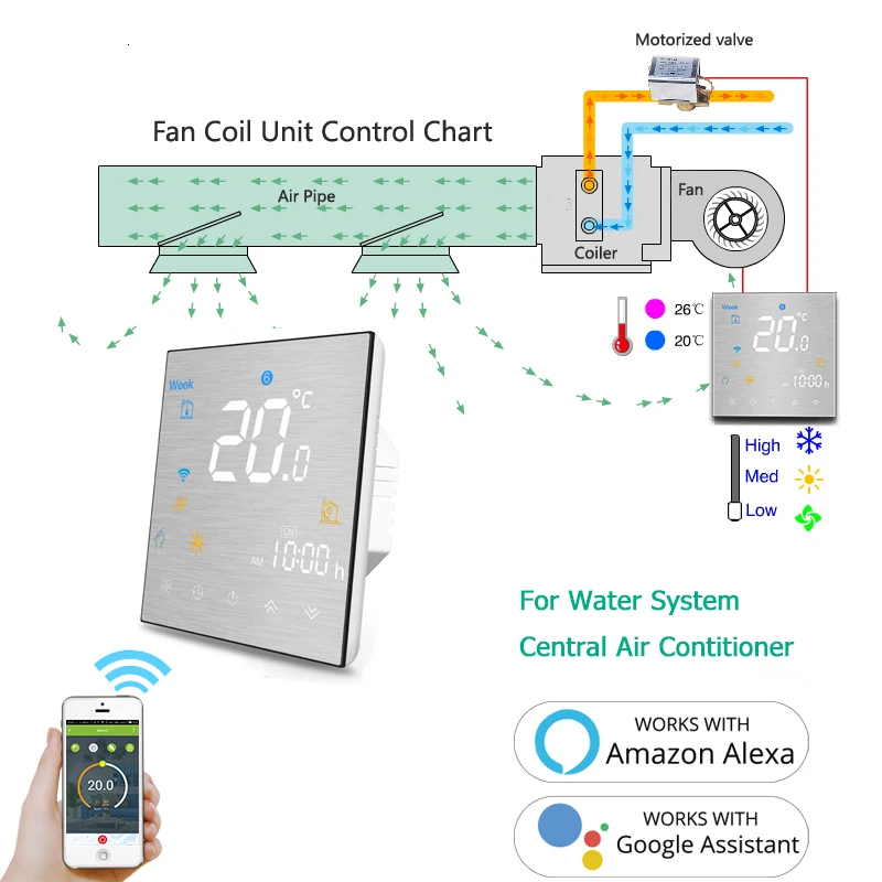 WiFi Central Air Conditioner Thermostat Temperature Controller 2 Pipe 4 Pipe 3 Speed Fan Coil Unit Work with Alexa Google Home