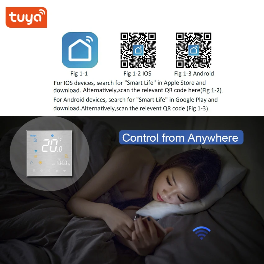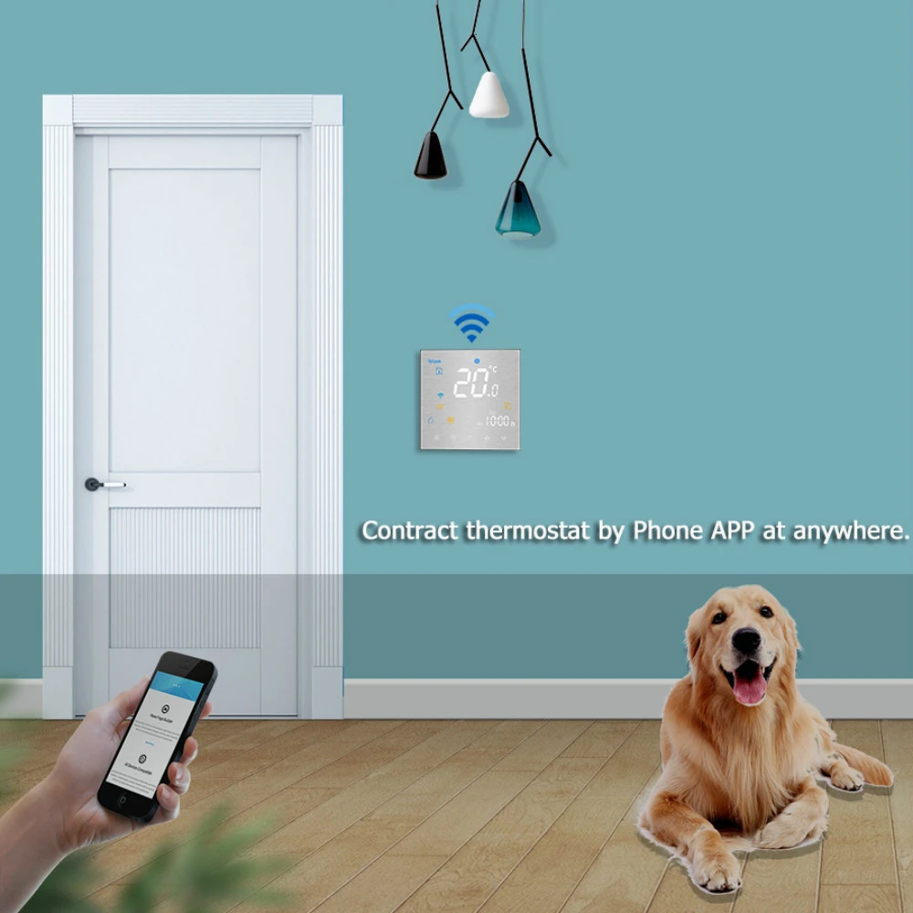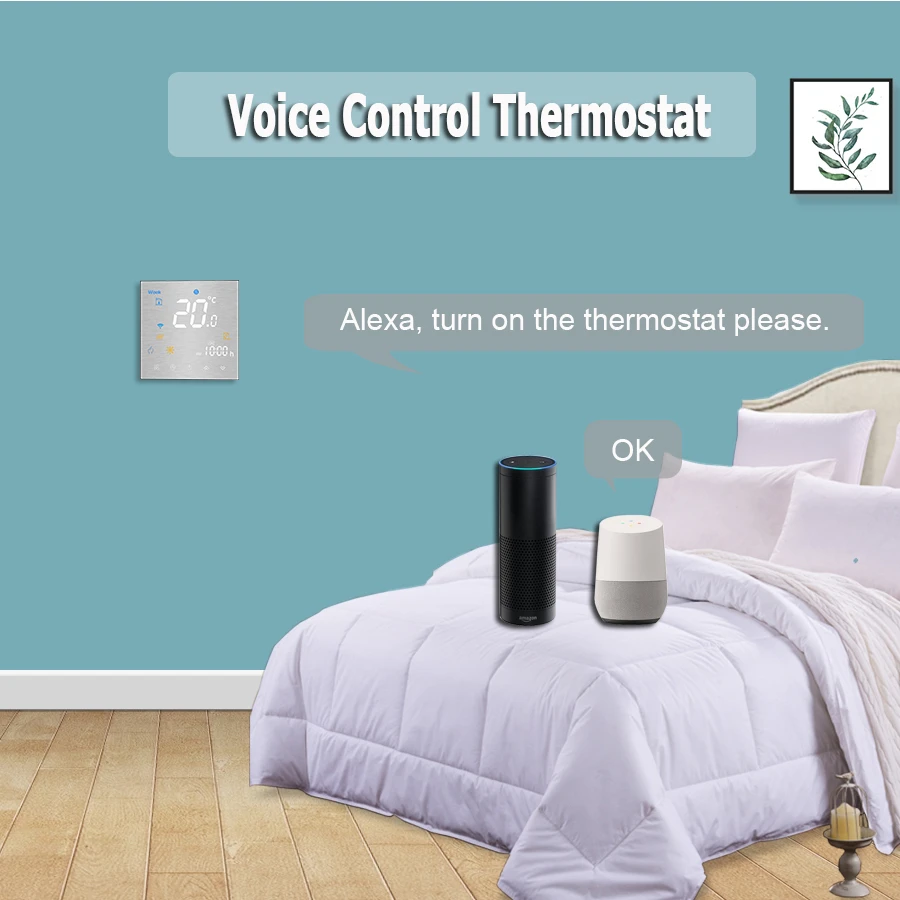 1.WiFi and Voice control (Integrated with Amazon Echo, Google Home, Tmall Genie, IFTTT.) , Tuya APP. 2.0.5°C Accuracy keeps temperature within the level you set. 3.Data memory when power is off. 4.5+2 six periods programmable maximize comfort and economy. 5.Creat thermostat group to Centralized control. 6.No limit to add rooms and support Smart Scene. 7.Powerfull functions are available such as WiFi. 8.All setting languages hynchronize your time zone, address and language.9.Keypad lock(children lock) function.