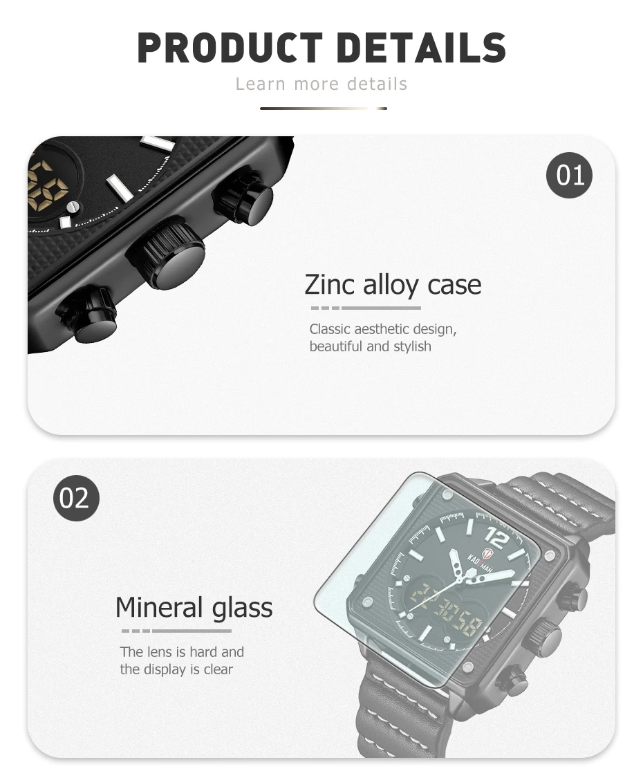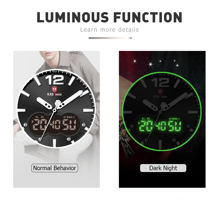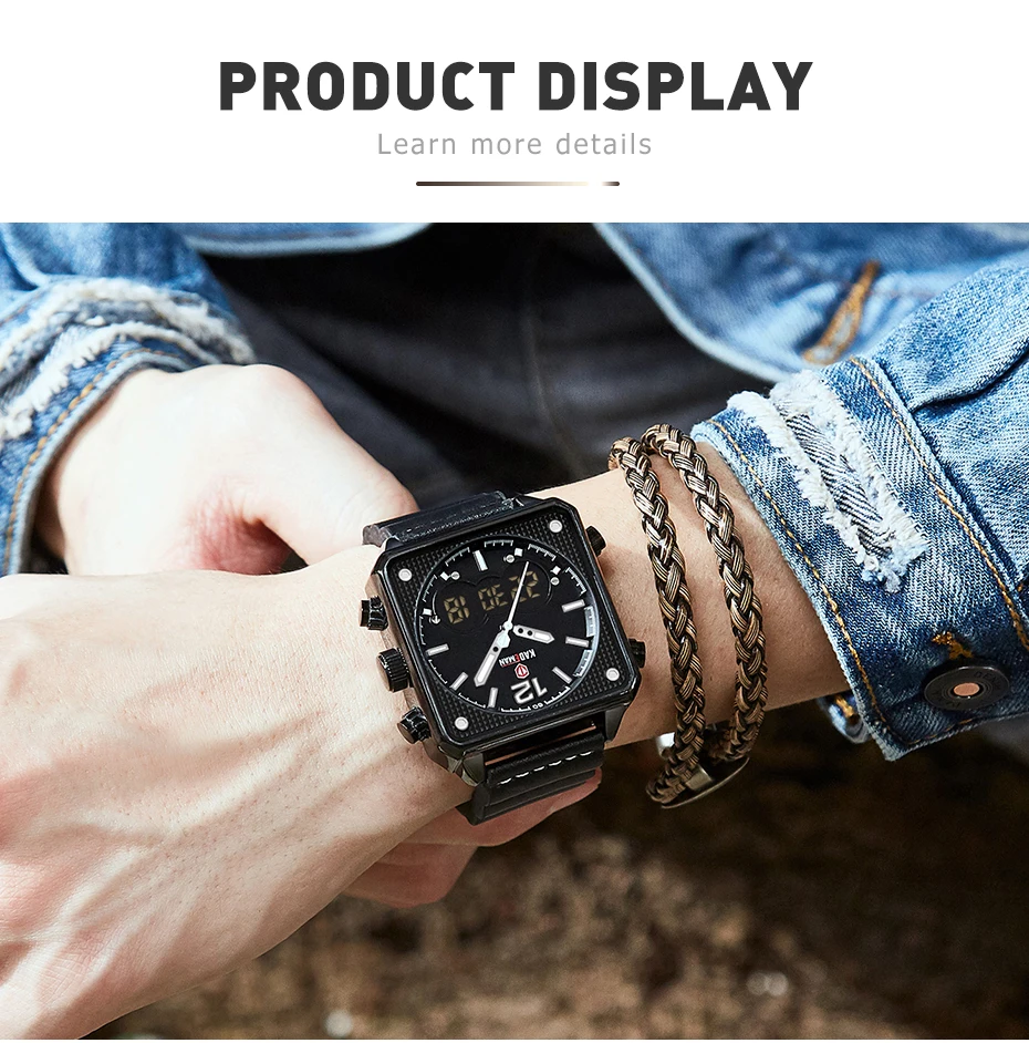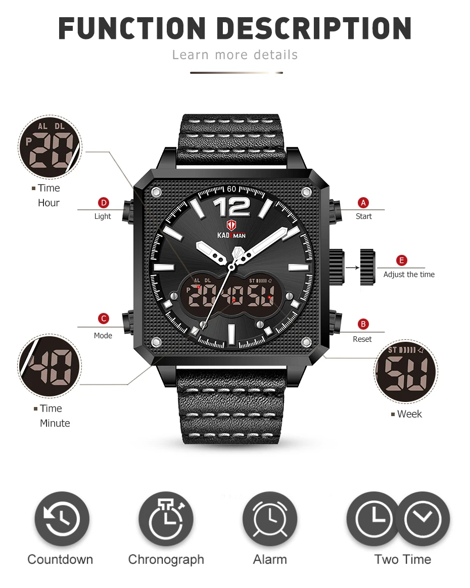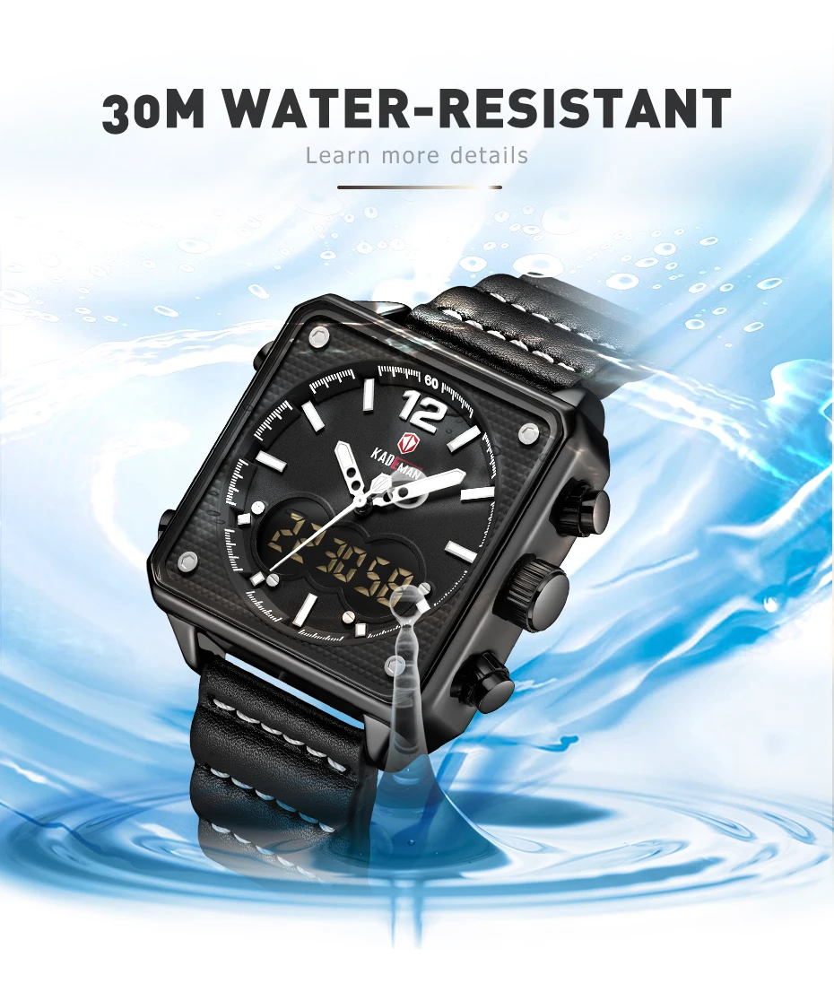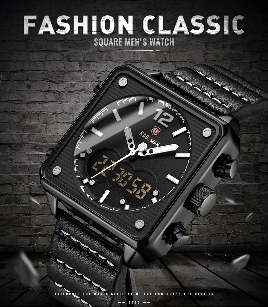 Бренд: kademan Серия: K9038 Часовой механизм: кварцевый механизм Дизайн; Квадратный корпус; Двойной дисплей; Уникальный ремешок Стиль; Спорт: Энергетический; Повседневный; Модный Основные функции -100% оригинальный бренд высшего качества -3ATMJ3OM Водонепроницаемость -Качественный чехол из нержавеющей стали