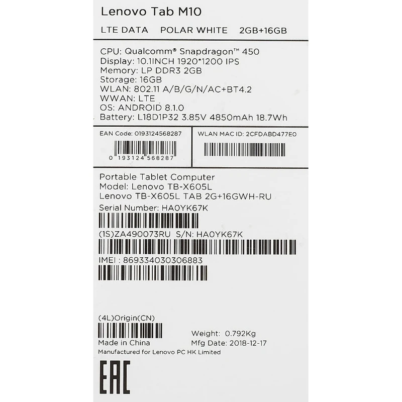 Планшет Lenovo Tab M10 TB-X605L Snapdragon 450 8C/2Gb/16Gb 10.1" IPS 1920x1200/3G/4G/And8.1/белый/BT Компьютеры и - купить