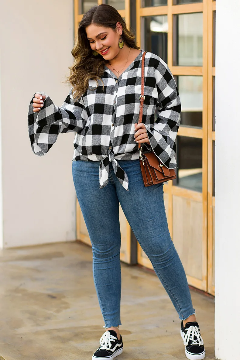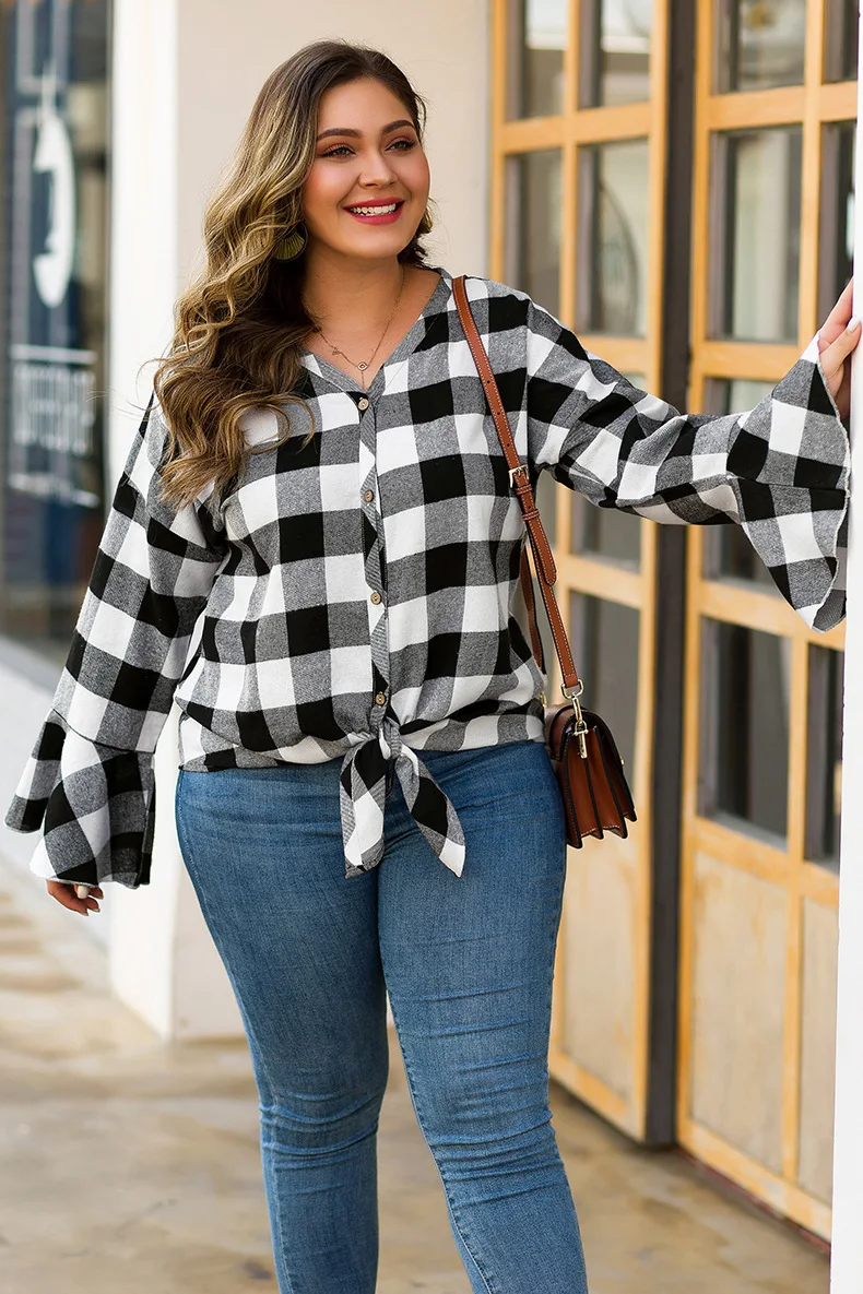 WHZHM Осенняя Клетчатая блуза женская с длинным Расклешенным рукавом на пуговицах - купить