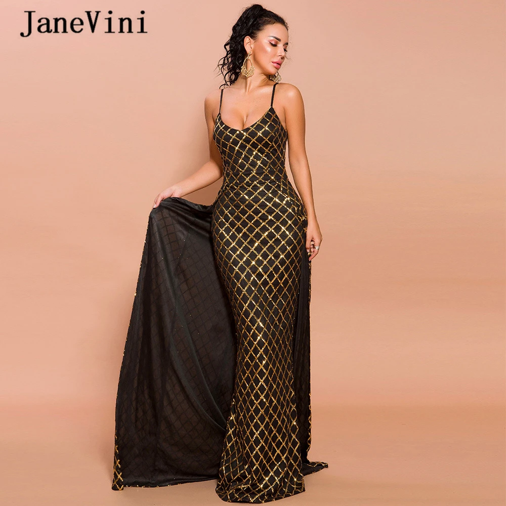 JaneVini, черное Золотое вечернее платье с блестками и шлейфом, платье Русалка на бретельках, Саудовская Аравия, вечерние платья со шлейфом