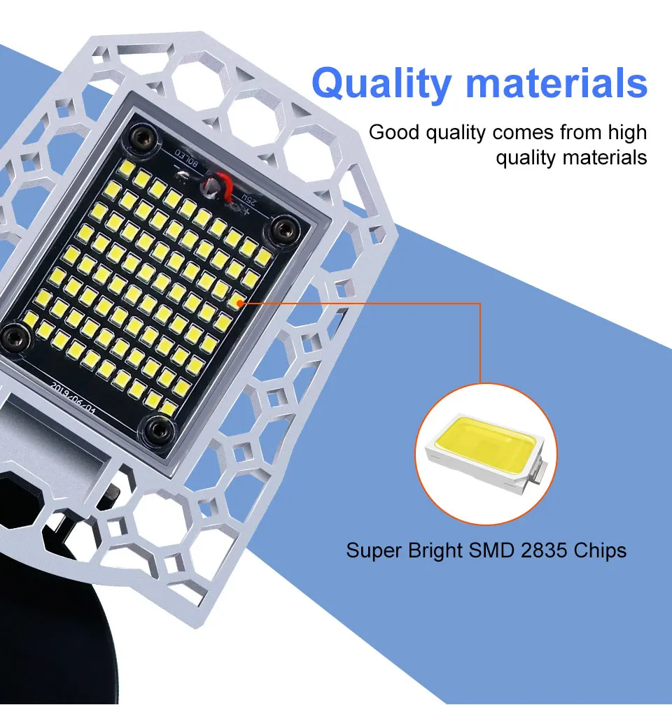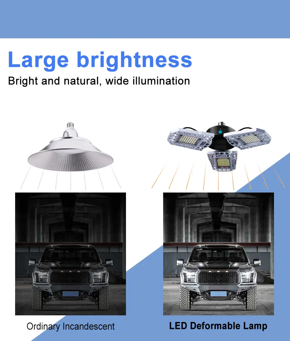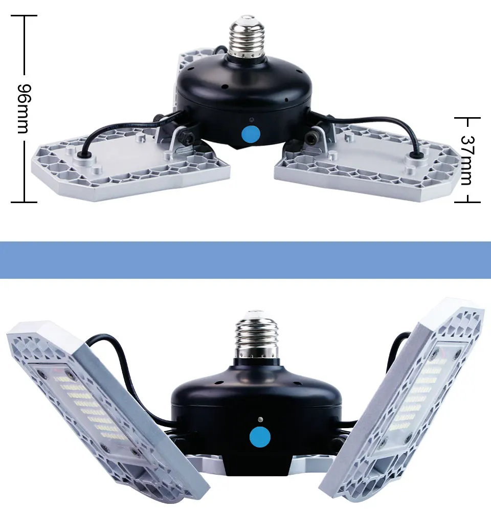 Супер Форма с7200 / 9600 / 12000Высокая светоотдача делает его супер яркой светодиодной лампой.Усовершенствованная система охлаждения, теплоотвод из алюминиевого сплава.Более стабильный и безопасный-высококачественный теплоотвод из алюминиевого сплава, высокая термостойкость и устойчивость к коррозии.Три алюминиевых светодиодный головки регулируются. Они могут быть сложены до 90, это сделает светильник более широким.Водонепроницаемый классIP65, Пыленепроницаемый и водонепроницаемый, использовать в помещении и на открытом воздухе, более безопасный.Датчик фотоэлемента, интеллектуальная сцена и светильник, более удобный срок службы,Яркость <40lux автоматическое включение,Яркость> 10 люкс автоматическое выключение; Переключатель управления Индукционным режимом.Характеристики:Водонепроницаемый:Да (обновление)/нет (обычный)Светильник-датчик:Да (обновление)/нет (обычный)Световой поток:7200лм-60 Вт/9600LM-80 Вт/12000лм-100 ВтРабочее напряжение:Переменный ток100 В-277 В(Для промышленного напряжения и домашнего напряжения)Тип основания:216 светодиодов/240 светодиодов/279 светодиодовМощность:60 Вт/80 Вт/100 ВтИсточник: светильникЧипы Epistar 2835Угол люминесценции:270 °Тип основания:Подходит дляE27/E26Цвет излучения:Теплый белый/холодный белыйРазмер раскладки:325*96 ммХарактеристика:3pcs Asjuatable головки лампы/светильник-датчик/водонепроницаемыйПрименение:Идеально подходит для гаража, склада, подвала, супермаркета, мастерской, сада, футбольного поля, уличной лампы и т. д.