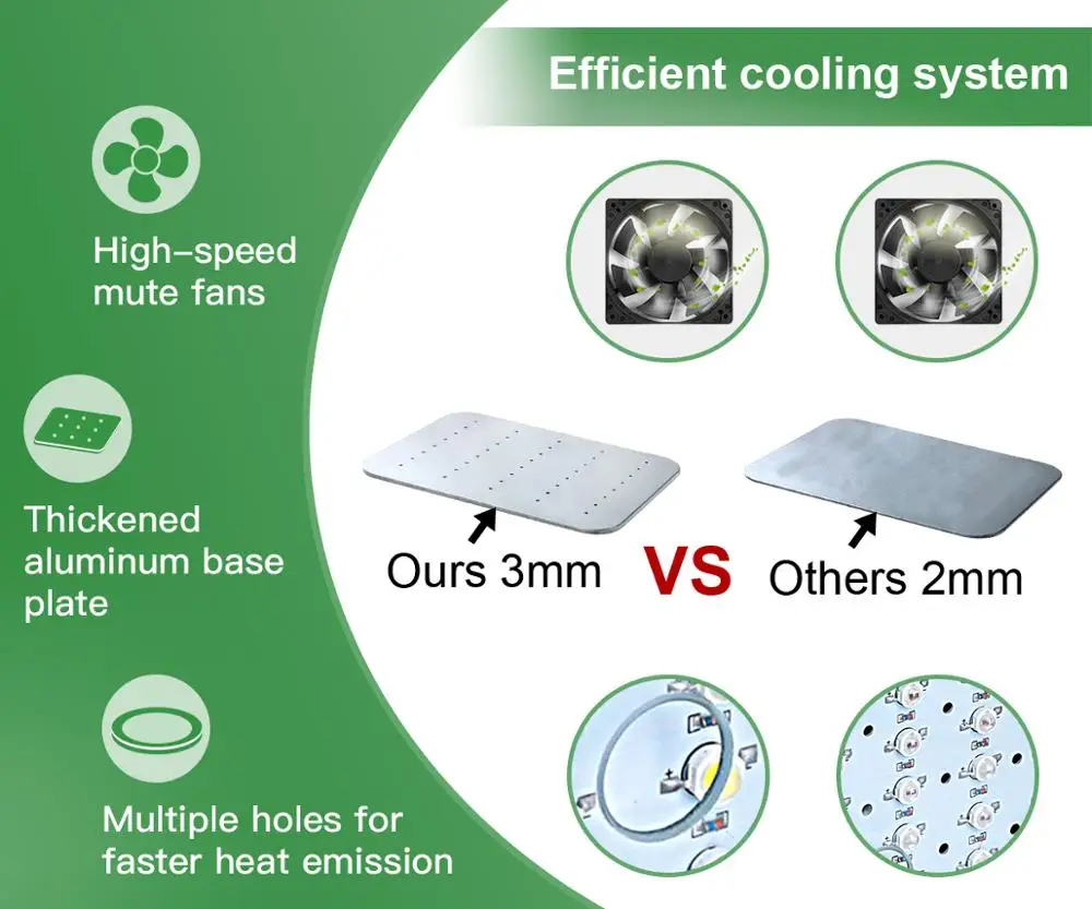 Усовершенствованная система охлаждения: несколько высокоскоростных бесшумных вентиляторов и модернизированных алюминиевых радиаторов позволяют лампе-светильник работать при температуре от 50 до 60 °F, что ниже, чем у других ламп. При более низких температурах ваше растение не будет гореть, что может увеличить время освещения и способствовать росту растений.