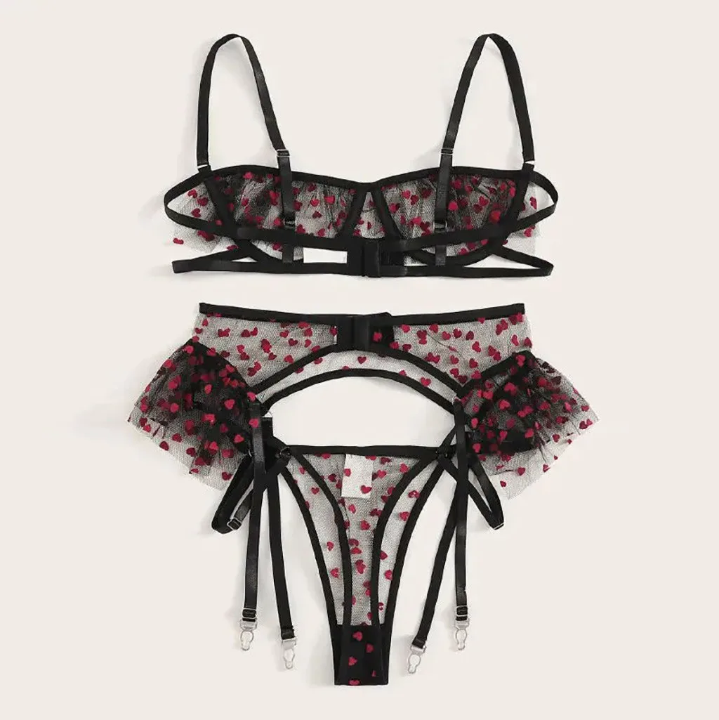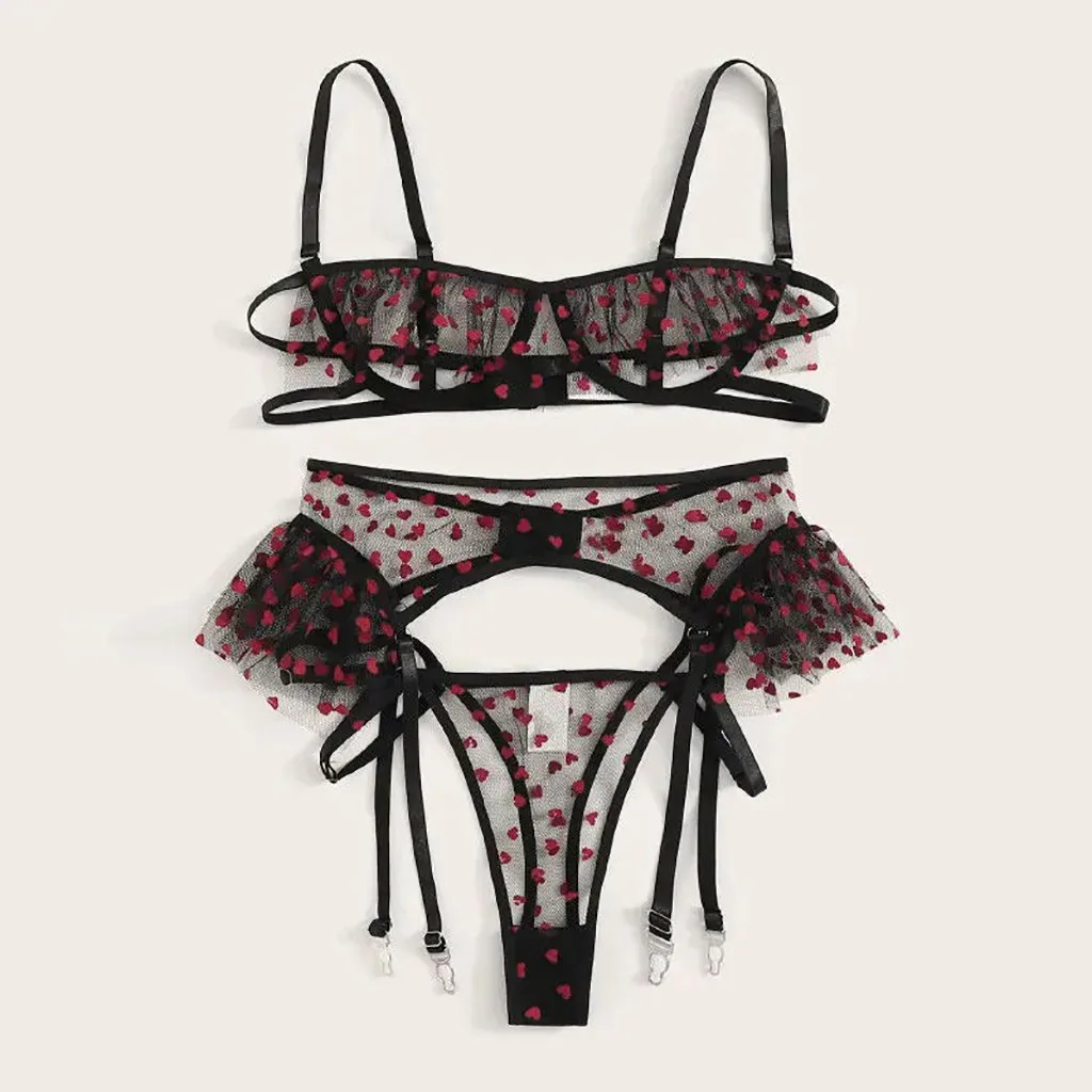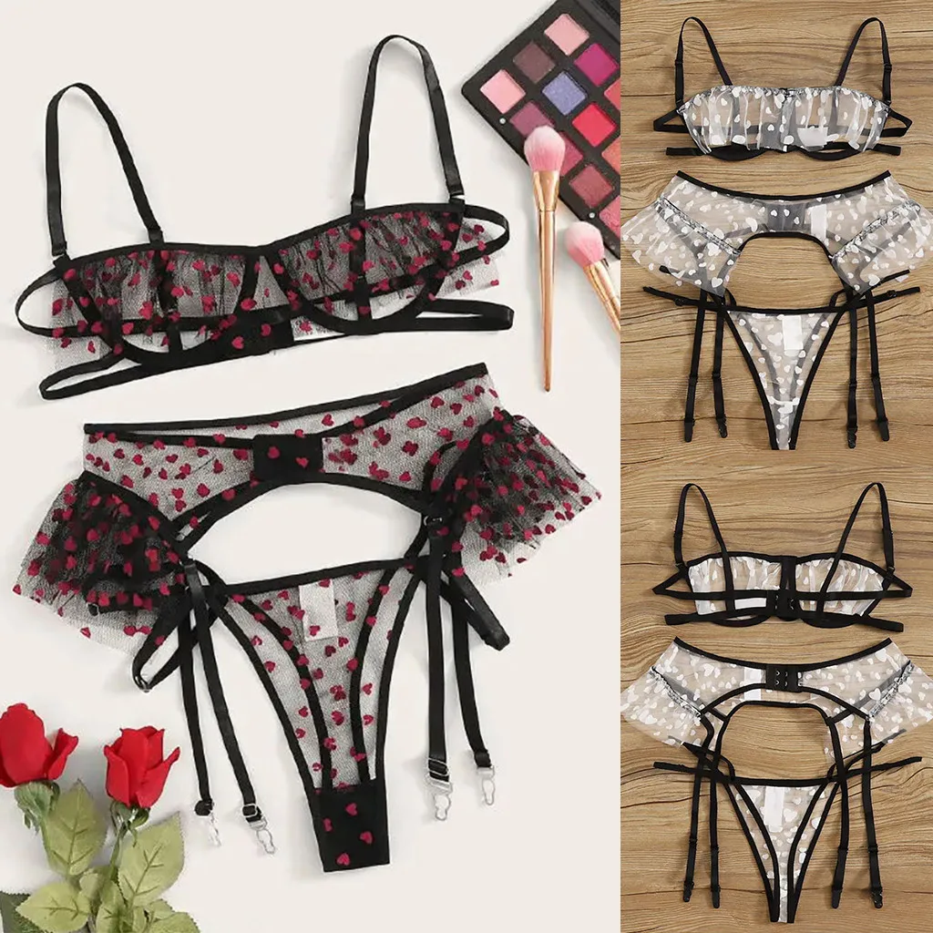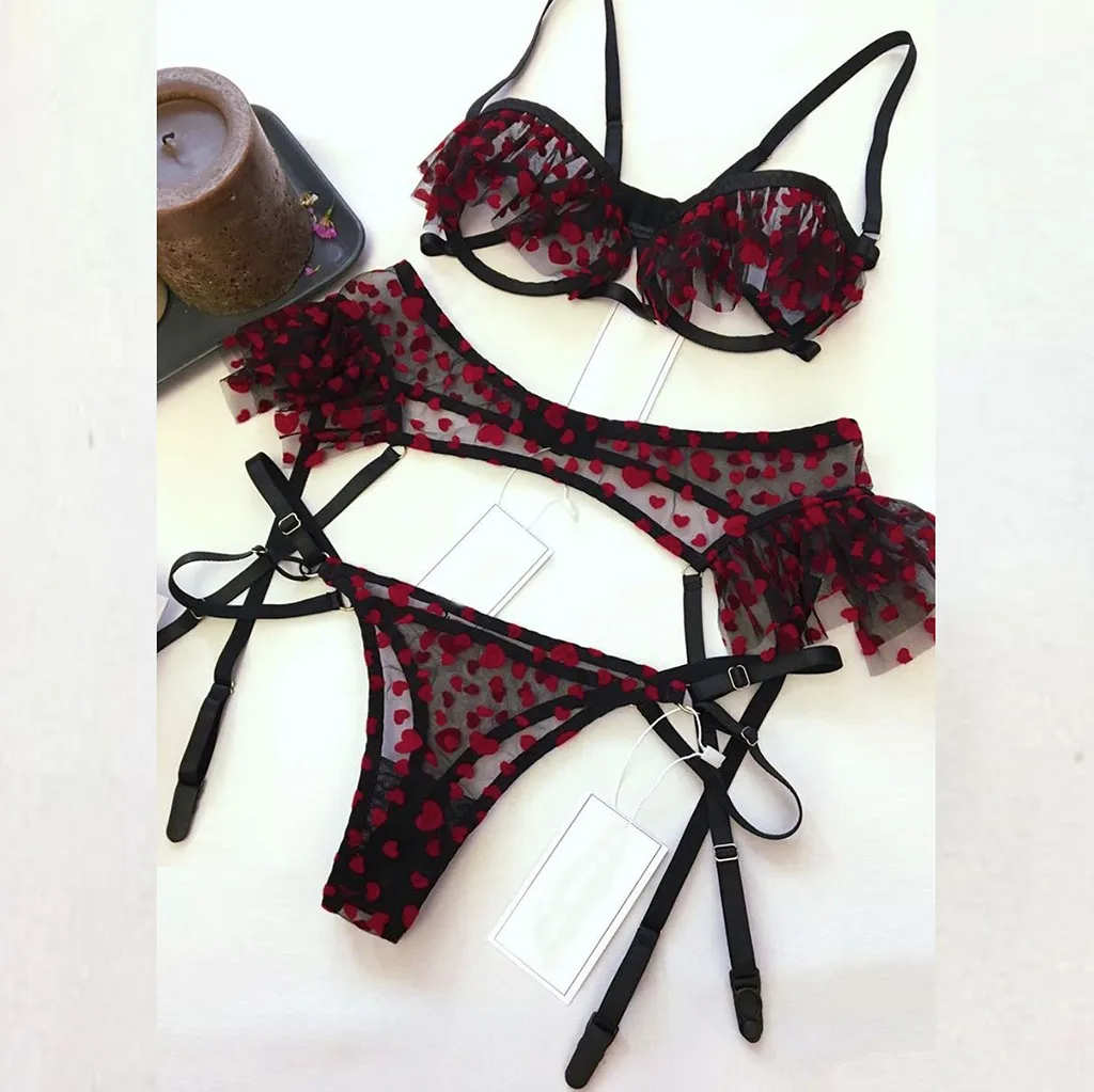 Пикантные изысканное кружевное белье бюстгальтер + пояс + шортики, комплект Ночная сорочка с резным узором, одежда для сна