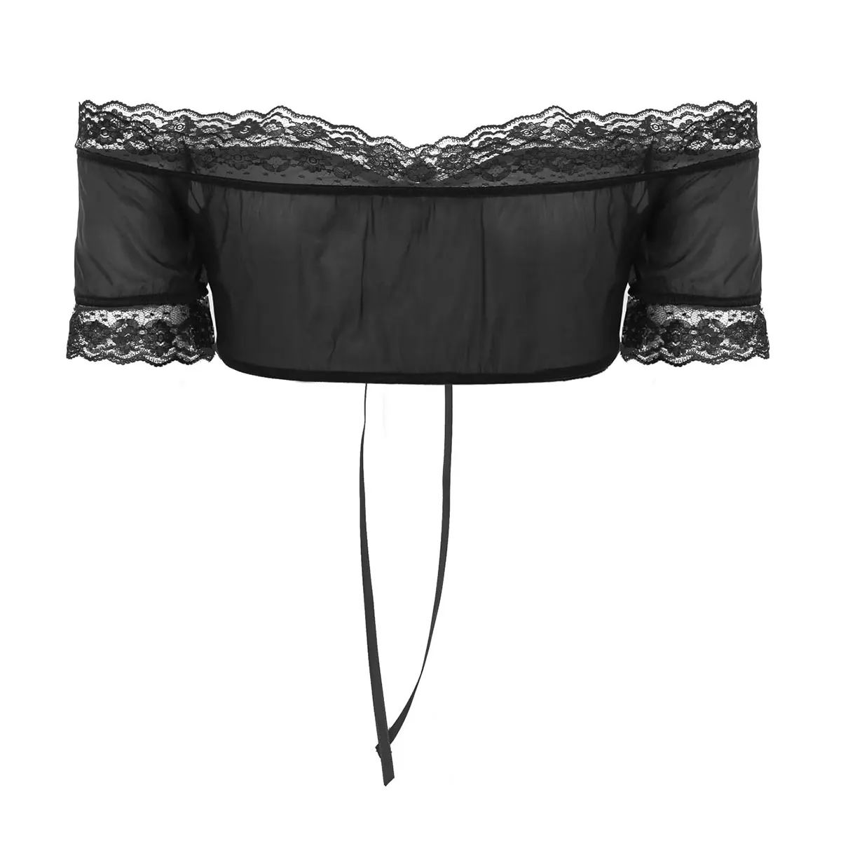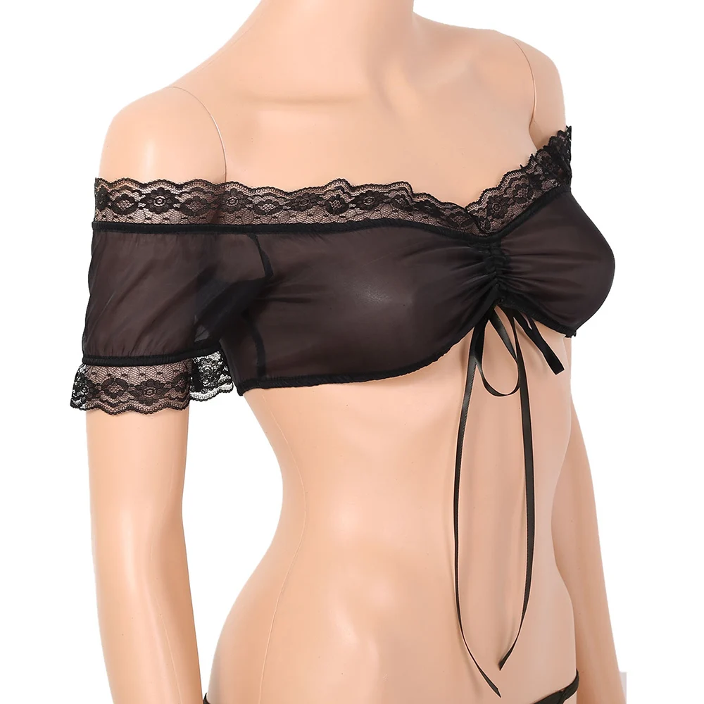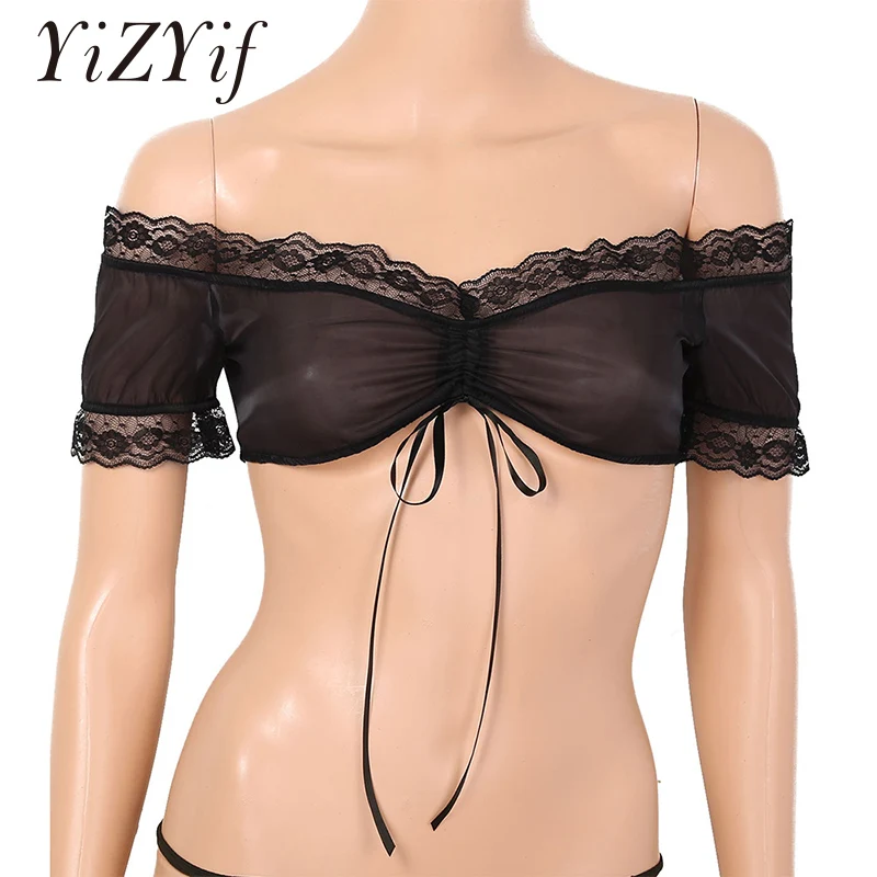 Отзывы о Кроп-топ женский прозрачный на шнуровке с открытыми плечами и короткими рукавами