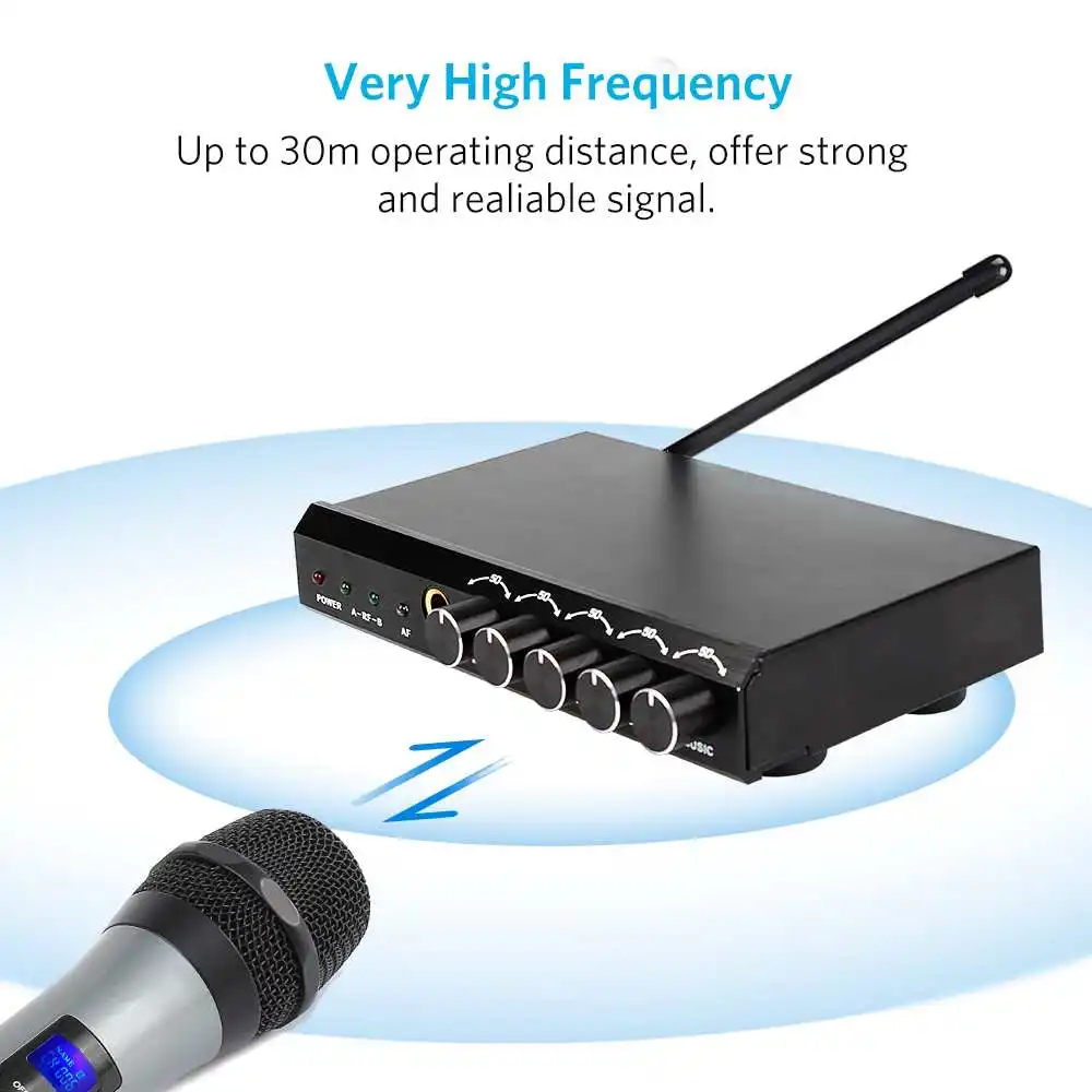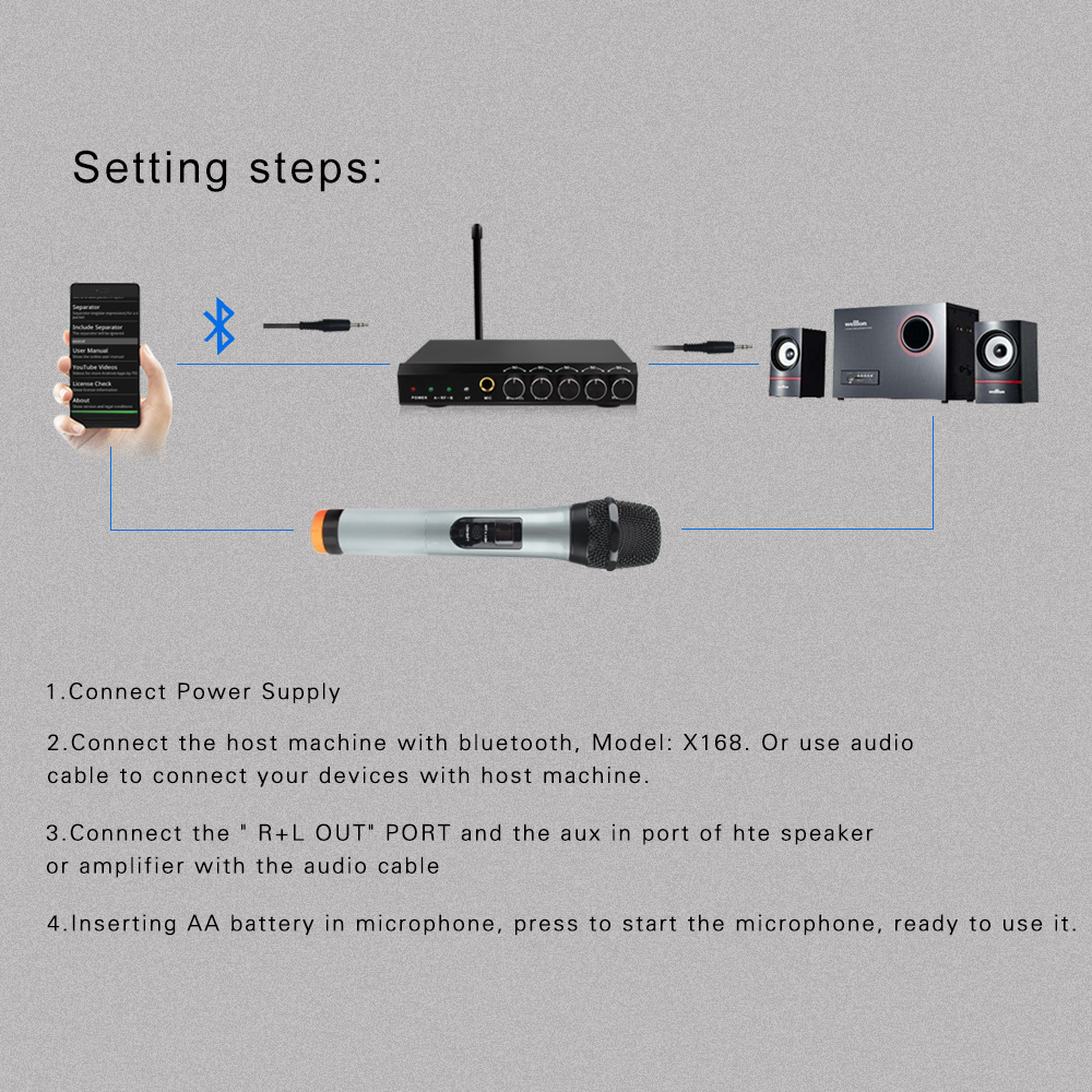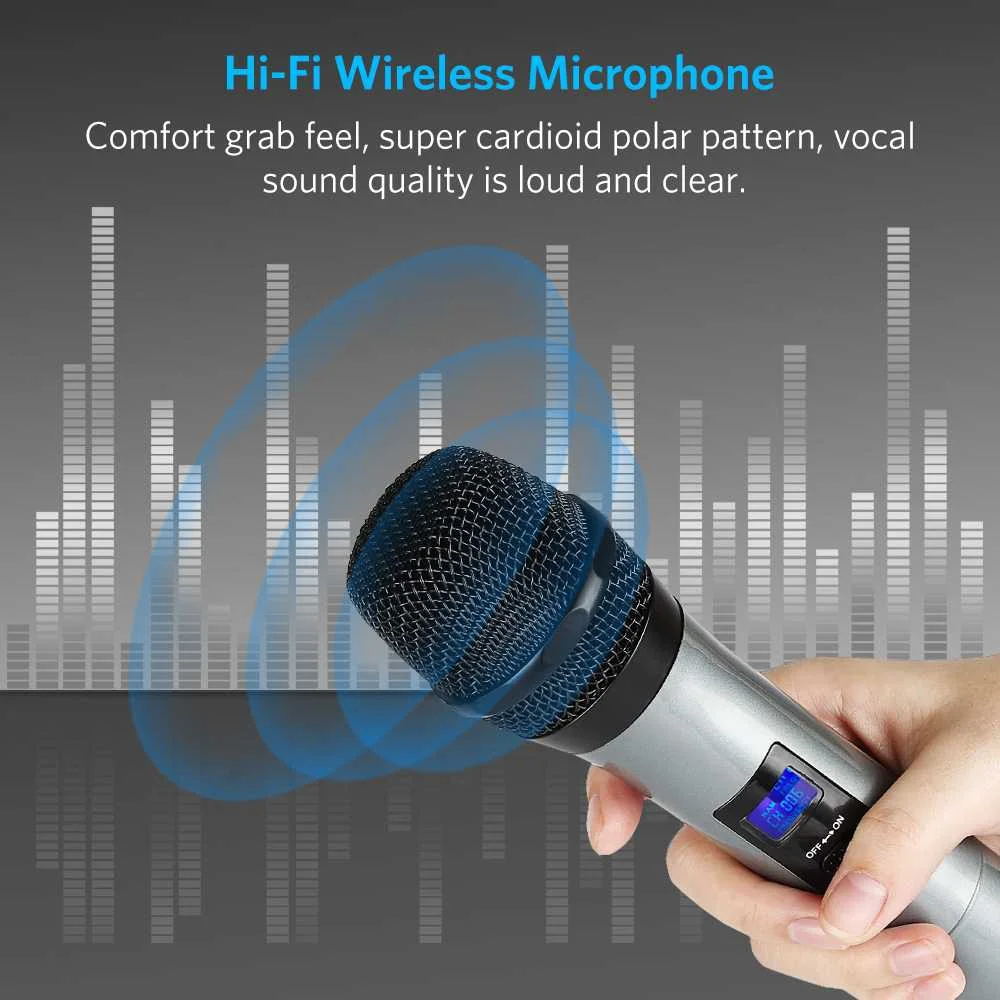 【Караоке беспроводной микрофон】 Поставляется с двойным портативным беспроводным микрофоном и приемником. Канал 2 микрофона и приемник легко синхронизируются. Входной разъем для микрофона 1/4 дюйма для дополнительного микрофона, 3 вокала могут петь вместе. Включая микрофон A Vol, Mic B Vol, внешний микрофон Vol, Echo, управление фоновой музыкой, который идеально подходит для караоке.