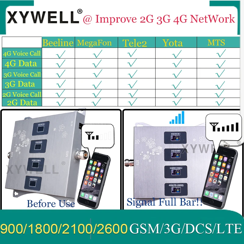 Этот усилитель подходит для GSM 900 МГц DCS1800mhz WCDMA2100mhz LTE2600MHZ частотный диапазон. Он может увеличить 2G 3G голосовые данные 4G. Пожалуйста, убедитесь, что вы можете получить по крайней мере 2 бара 2600 МГц (полоса 7) 900 МГц (полоса 8)1800 МГц (полоса 3)WCDMA2100(FDD полоса 1) сигнал на открытом воздухе перед покупкой, в противном случае этот продукт не может вам помочь. Для улучшения сигнала в помещении необходим хороший внешний сигнал.