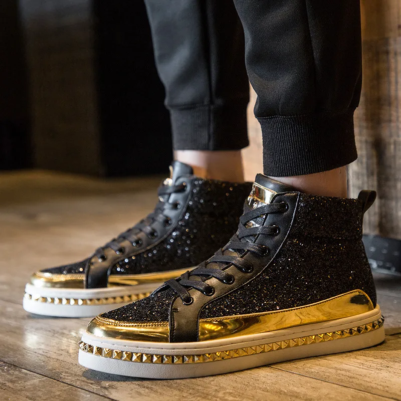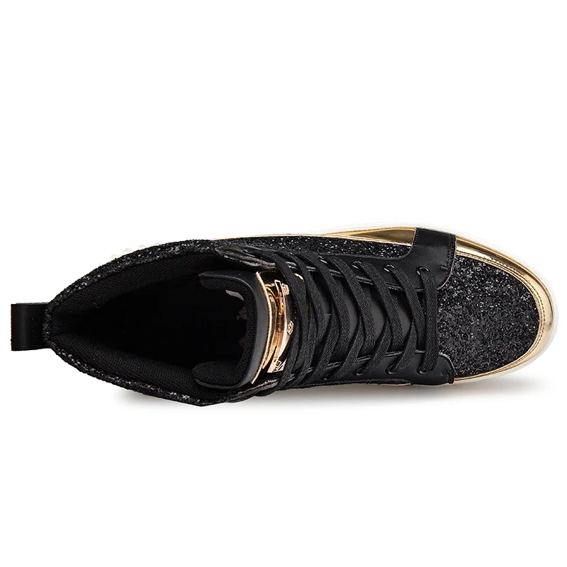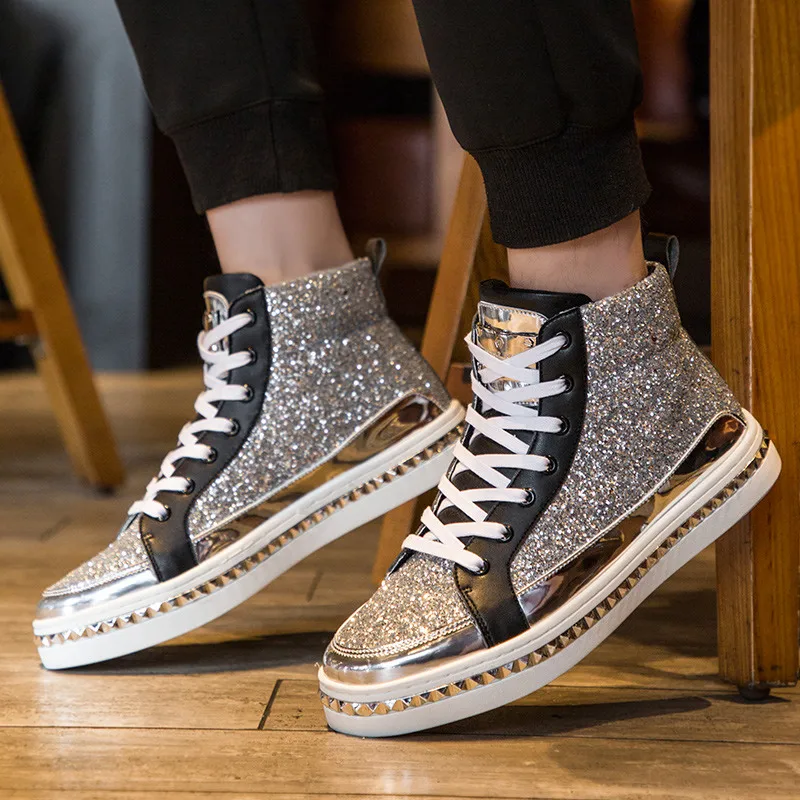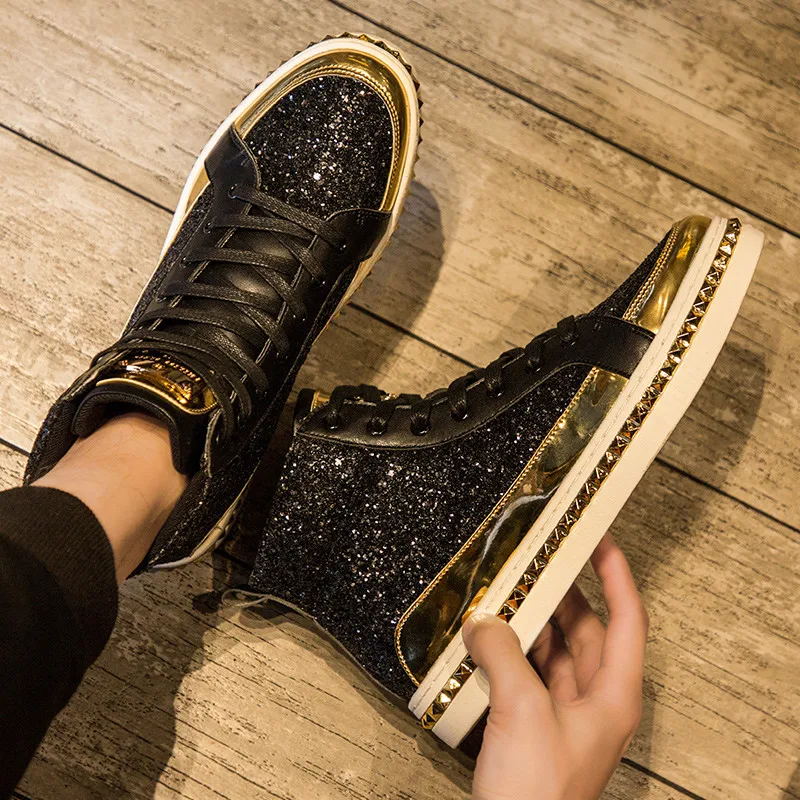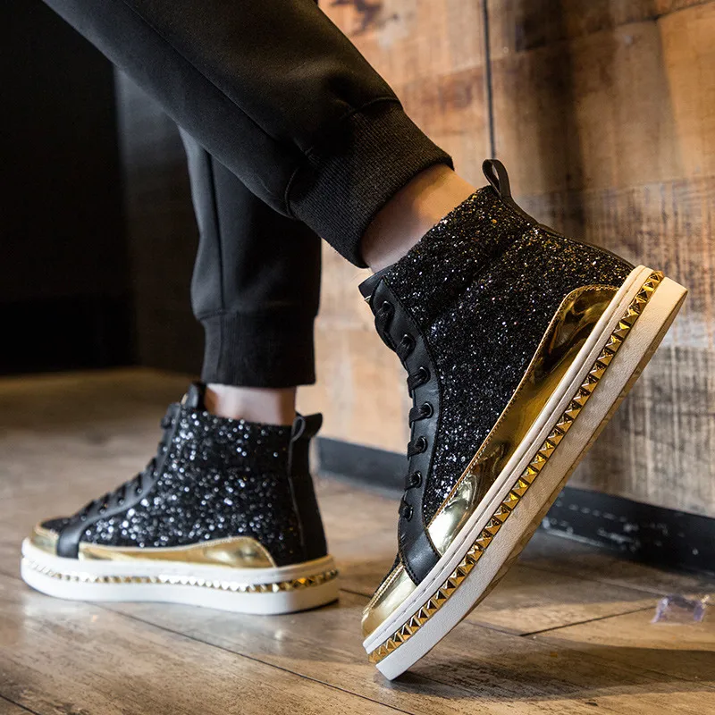 Black High top Men Fashion Sneakers Glitter Shoes for Bar Club Disco Mirrors Footwear Hop hop Platform Men Shoes Casual Sneakers