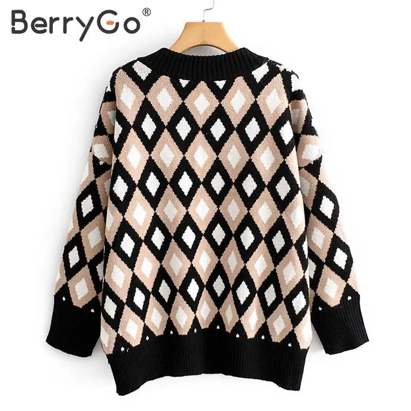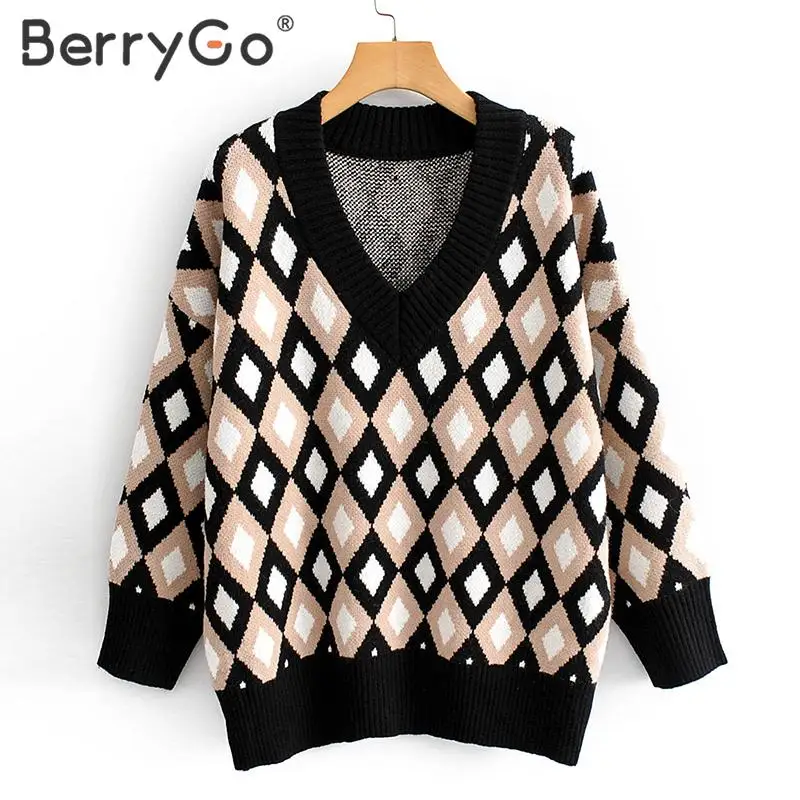 Отзывы о BerryGo винтажный клетчатый свитер с v-образным вырезом пуловер для женщин уличная