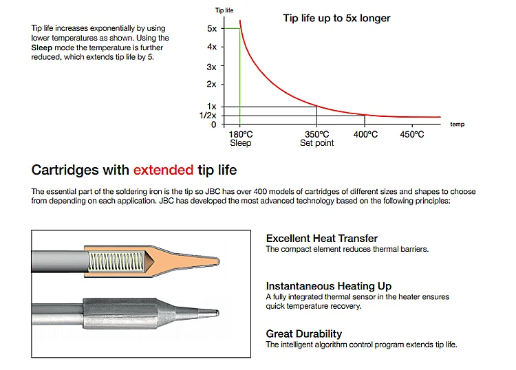 JBC долгий срок службы советы предлагают мгновенный нагрев, отличную передачу тепла и большую долговечность.