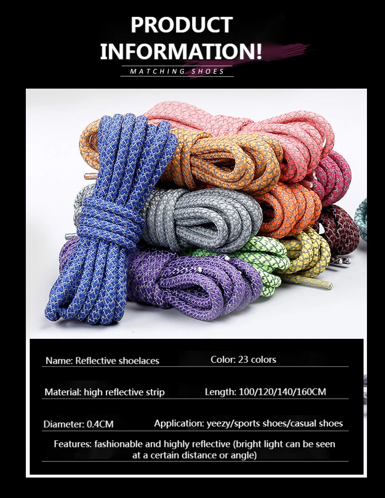 Добро пожаловать в наш магазин Дорогие друзья: При размещении заказа обратите внимание на следующие пункты! Наименование: Светоотражающие круглые шнурки Материал: полиэфирная пряжа Длина: 100/120/140/160 см Ширина: 0,4 см Цвет: 19 цветов цвет s Транспортировка: отправка в течение 48 часов Посылка: 1 пара шнурков (2 шт.) (Вы также можете добавить примечание к заказу, чтобы сообщить нам свои вопросы и требования) Примечание: сам шнурок не выделяет света. Она требует освещения и просмотра с разных ракурсов, а шнурок производит светоотражающий эффект.