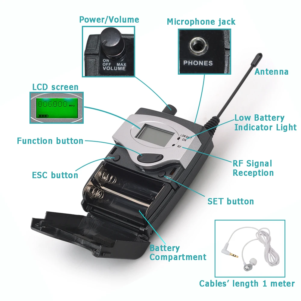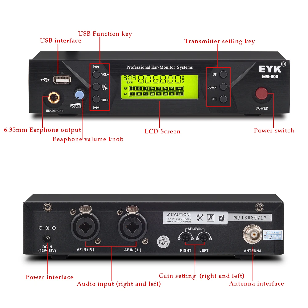 1. UHF полоса фазный замок PLL дизайн, в 32 МГц частотный диапазон, предустановленный 40 частот может быть переключен по желанию. Частоты A: 572-603,5 МГц Частота B: 606-613 МГц Частоты C: 740-771,6 МГц Частоты D: 798-830 МГц 2. Передатчик спереди: металлическая коробка, USB интерфейс, 6,35 мм разъем наушников, наушники, регулятор громкости, USB функциональную клавишу, ЖК-дисплей экран, передатчик Установка для ключей, Мощность переключатель 3. Задняя часть передатчика: интерфейс питания, аудиовход (справа и слева), Настройка усиления (справа и слева), интерфейс антенны 4. Приемник: выключатель питания/регулятор громкости, 3,5 мм стерео разъем для наушников, ЖК-экран, индикатор низкого заряда батареи, лампа радиочастотного индикатора приема, клавиша функции приемника 5. Один канал передатчика может подключать неограниченные приемники 6. Диапазон: до 260 футов (до 80 метров) 7. Заряда батареи: 2*1,5 V AA (не прилагаются)