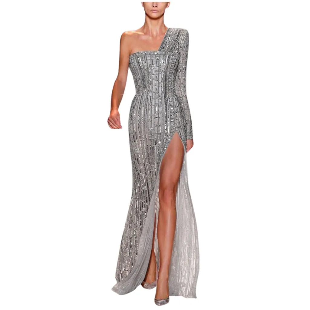 Купить Женское вечернее платье с блестками однотонное открытыми плечами и длинным