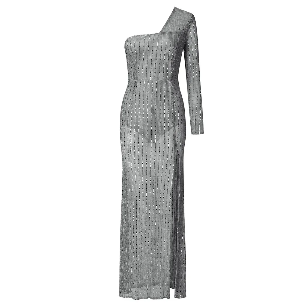 Женское однотонное блестящее платье с открытыми плечами, вечернее платье с длинным рукавом