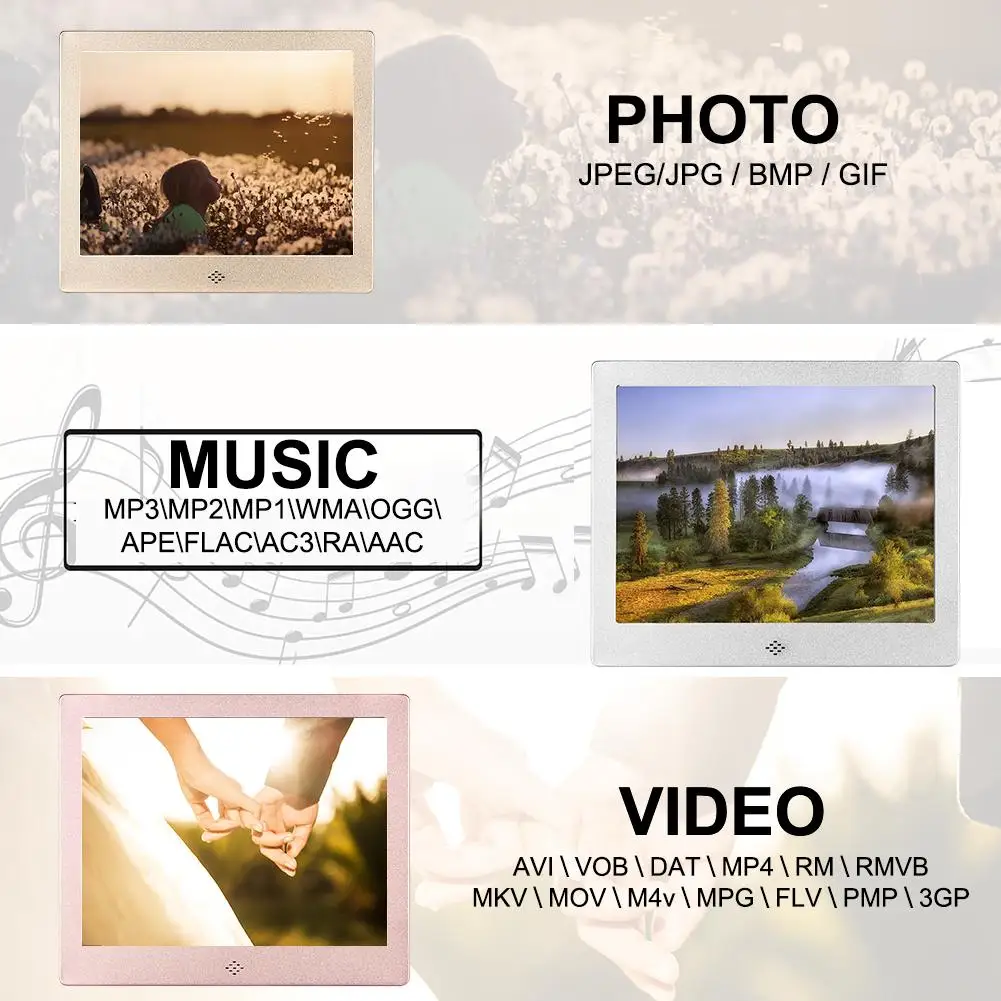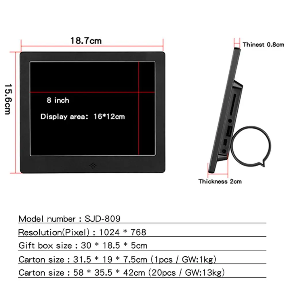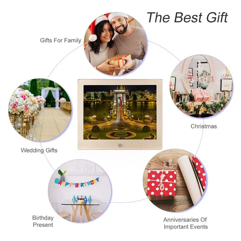 Пункты маркированного списка:1 、 с высоким разрешением Экран: 8-дюймовая цифровая фоторамка, 1024x768 разрешение, 4:3 светодиодный Экран, высокое разрешение изображения и видео-дисплей.