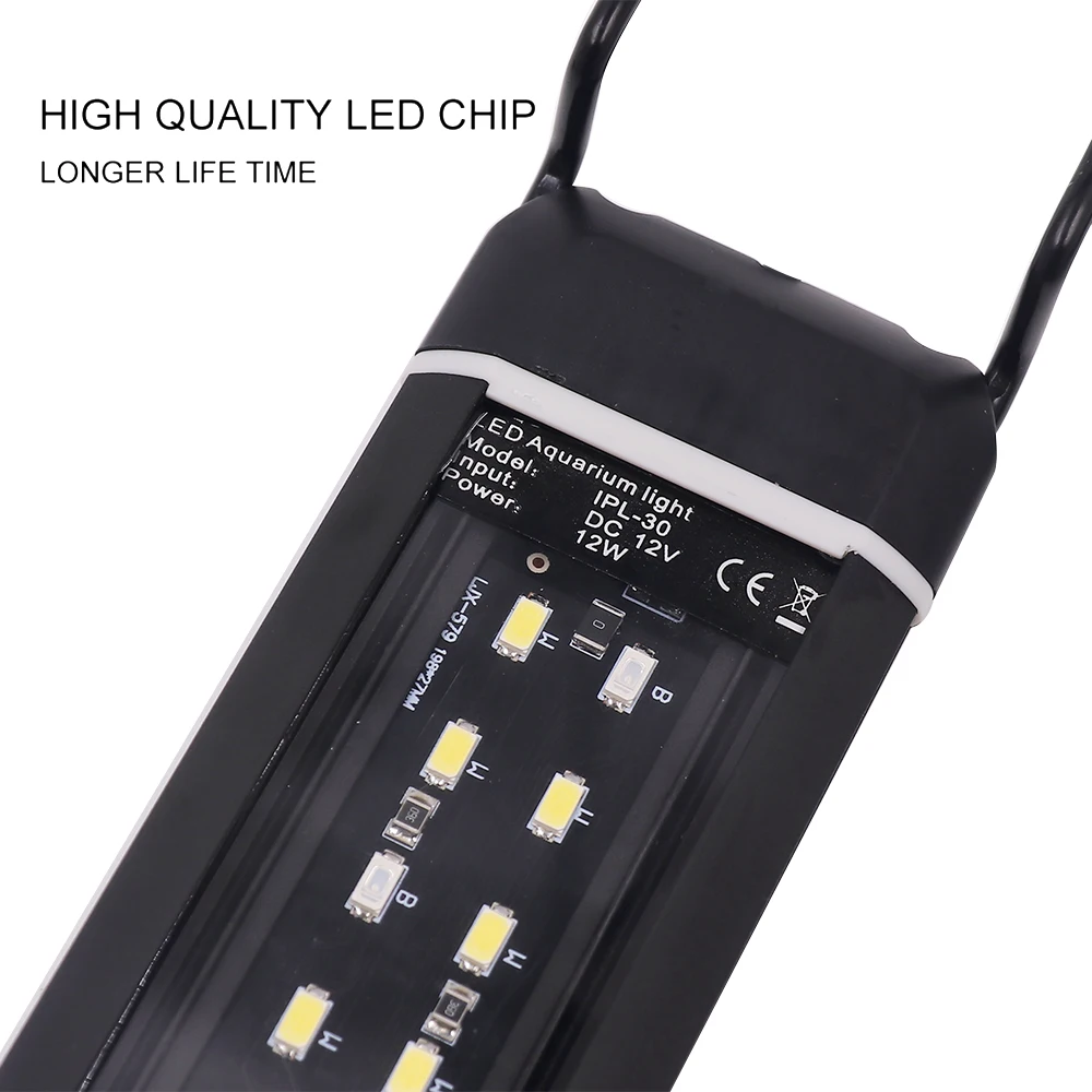 Kindly Note:1. Please allow 1-2mm error due to manual measurement, make sure you do not mind before you bid.2. The colors may be different for different display, please understand. Package Included:1 * LED Aquarium Light1 * Power Plug Description:Item: LED Aquarium LightLED Chip:SMD 5730Material: ABSStyle: IPL-30, IPL-50Power:12W(IPL-30),24W(IPL-50)LED Color: IPL-30:9 Cold White +9 White + 6 Blue IPL-50:18 Cold White +18 White +12 BlueLED Quantity: IPL-30: 24LEDs , IPL-50: 48LEDsSuit for Aquarium Size: IPL-30:28-46cm , IPL-50:46-63cmSize:IPL-30:260*55*17.2mm IPL-50:430*55*17.2mmWaterproof Rate: IP67 WaterproofColor Temperature: Cold White:6500-7000K , White:5500-6000K , Blue: 450-460NMLumen: White:55-60lm/pc Blue:6-8lm/pcLifespan: More Than 50000 HoursWorking Temperature: 0 to 40℃Holder Extended Length:280-460mm(IPL-30)460-630mm(IPL-50)Plug: EU/US/UK/AU Plug Features:1.Specially designed LED, which can promote the photosynthesis of aquatic plants and suitable for water plant grow.With low power consumption, high energy saving and no radiation.2.It can provide a sufficient degree of lighting to meet the fish tank and you can view the fishes at the tank clearly.3.The acrylic support sheet makes the light easier to install on the tank.4.Perfect for different size open aquarium and fish tank.