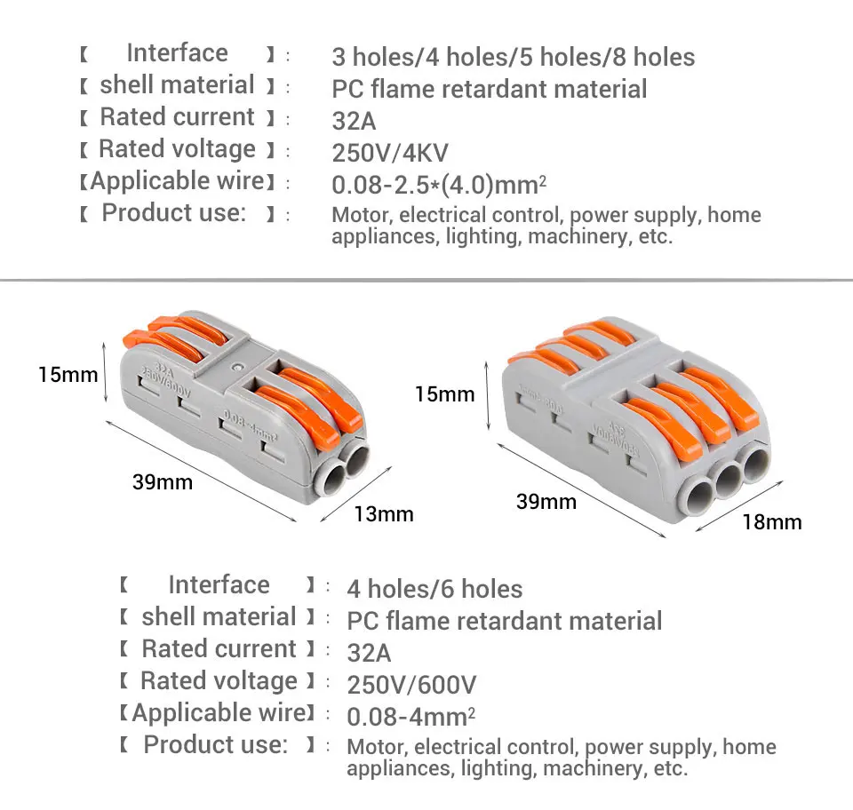 Описание: Название продукта: Универсальный проводной разъем Номер модели: PCT212, PCT213, PCT214, PCT215, PCT218, PCT222, PCT223, PCT412, PCT413, PCT414, PCT415, Материал изоляции: модифицированный нейлон (PA66) Контактный материал: Фосфорная медь Сечение провода: 0,08-2.5mm2 (один жесткий провод); 0,08 ~ 4mm2 (мульти мягкий провод) Цвет: серый, оранжевый Номинальный ток: 32 А Номинальное напряжение: 250 В Номинальное импульсное напряжение: 4 кВ Номинальная мощность 8KW Манометром 28 ~ 12AWG Длина ленты: 9 - 10 мм