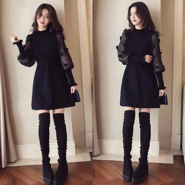 Платье женское кружевное в Корейском стиле милое элегантное свободное черное - купить