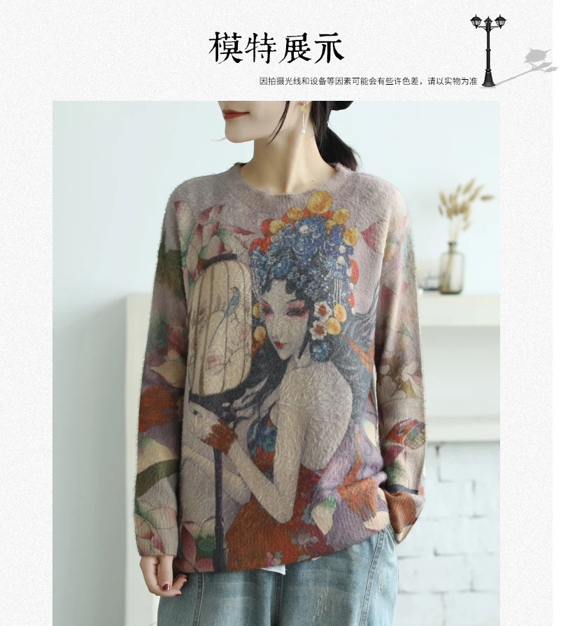 Spring Autumn Sweater Women 2020 New Knitting Loose Pullovers Tops O-Neck Retro Character Casual All-match Женская одежда - купить
