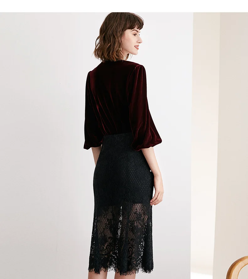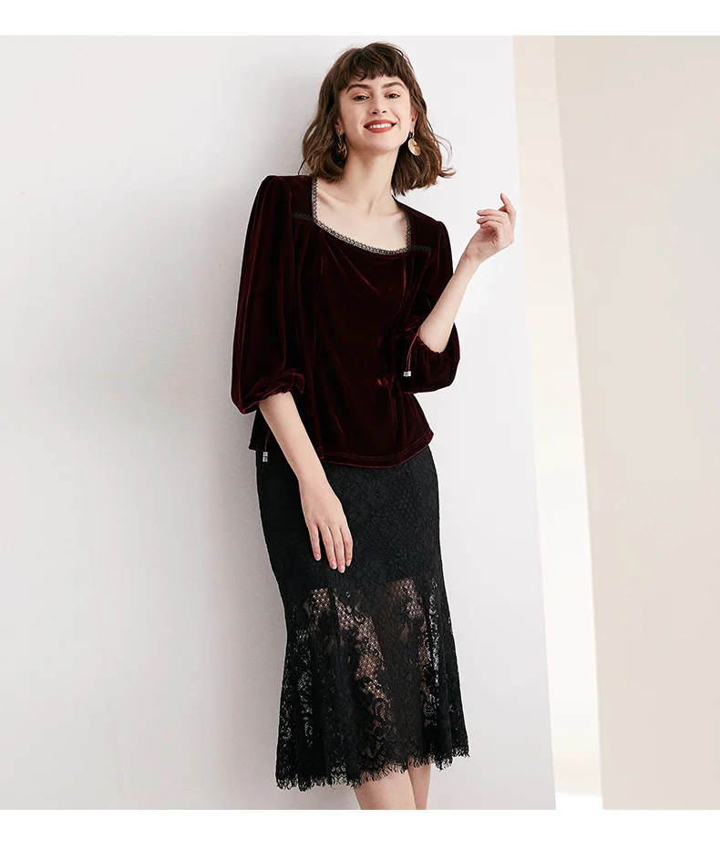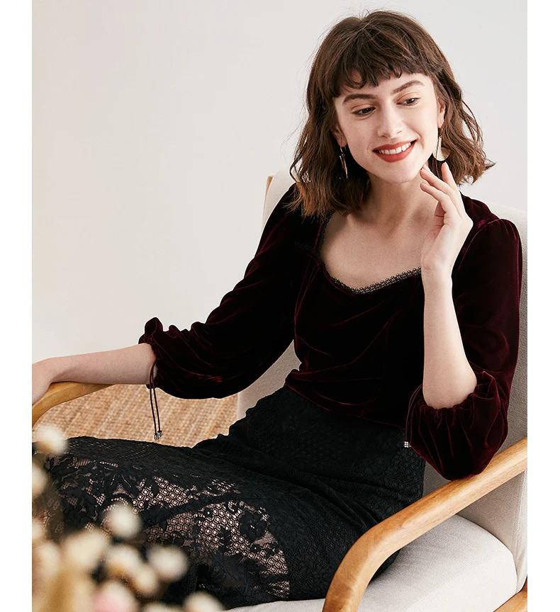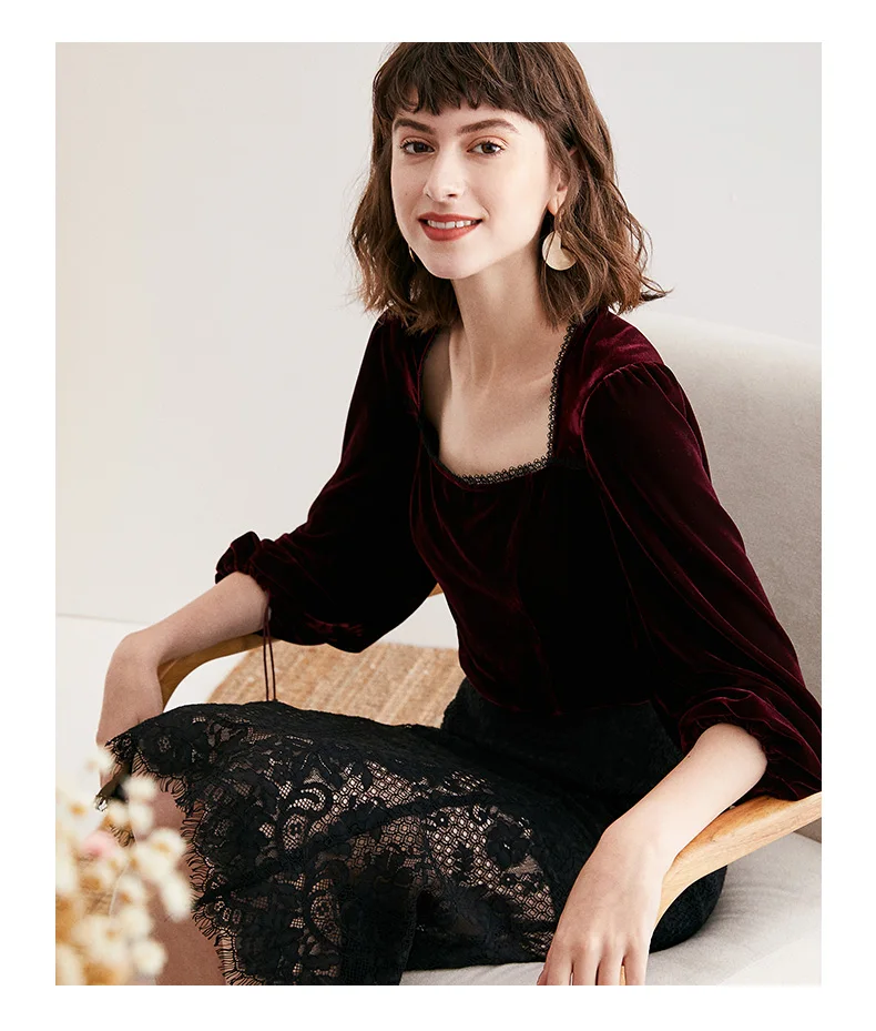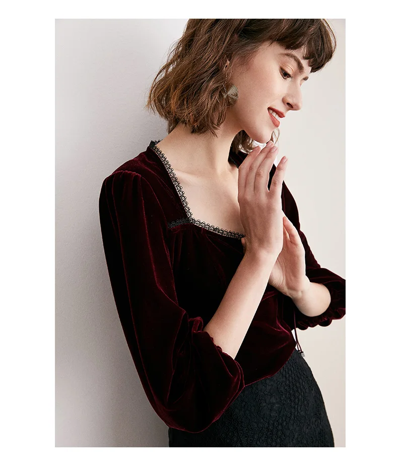 POKWAI square collar long sleeve tops korean style wine red shirts Женская одежда - купить