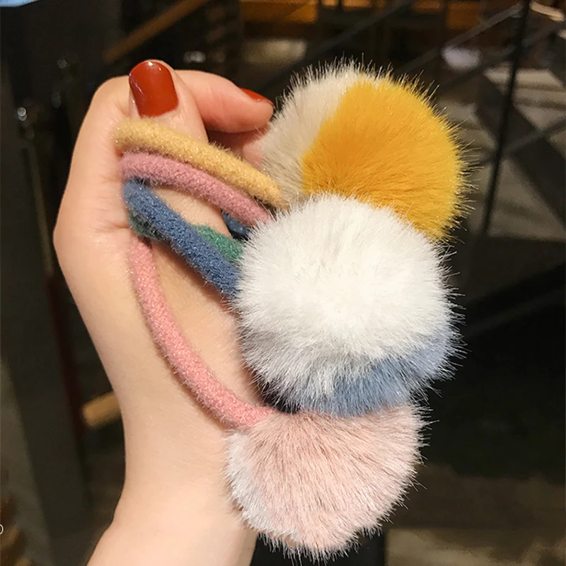Карамельный цвет Искусственный мех мяч веревка для волос помпон эластичная резинка для волос резинка для хвоста лента