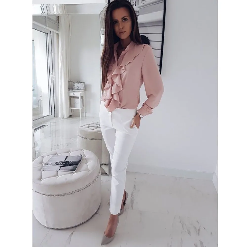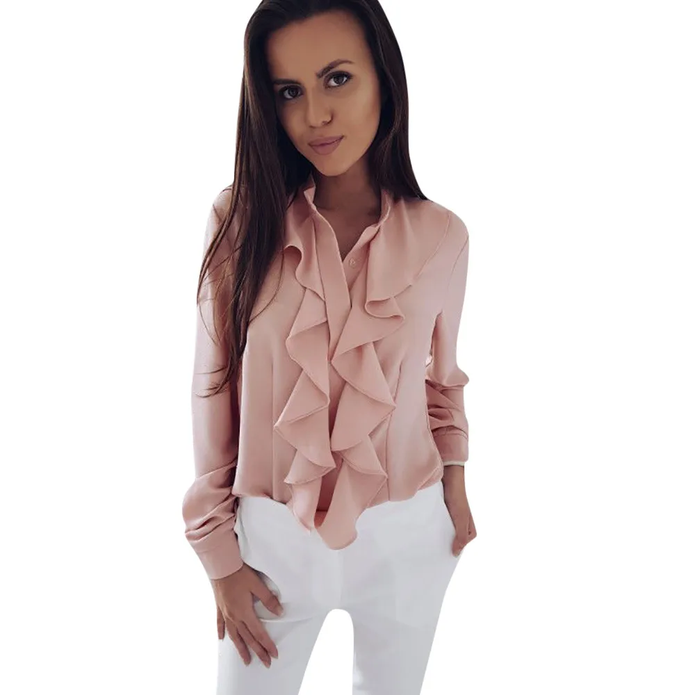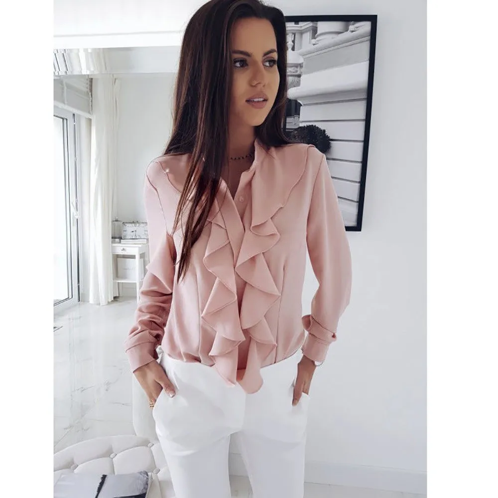 Женская блузка с длинными рукавами и оборками спереди, офисные Топы для женщин