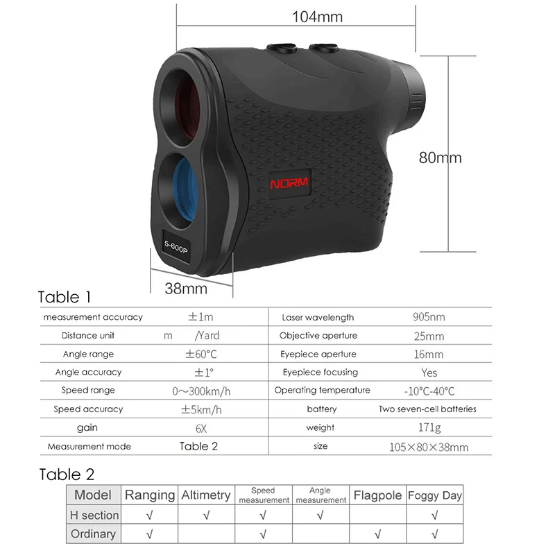 Функции:Режим измерения расстояния, режим сканирования, режим Pinseeker, режим измерения скорости, режим тумана + Около 900H 1200H 1500H: Новая модель для этогоДальномер er, с измерением высоты и измерением уровня (от-60 до 60 градусов). |