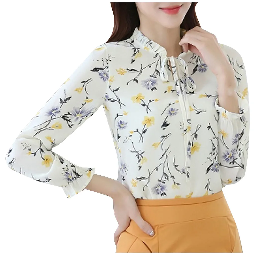 Купить Fashion Chiffon Bow Tie Blouse Casual Summer Ladies Print Sexy V-Neck Tunic Tops Female Women Long Sleeve Shirt Blusas Pullover | Женская