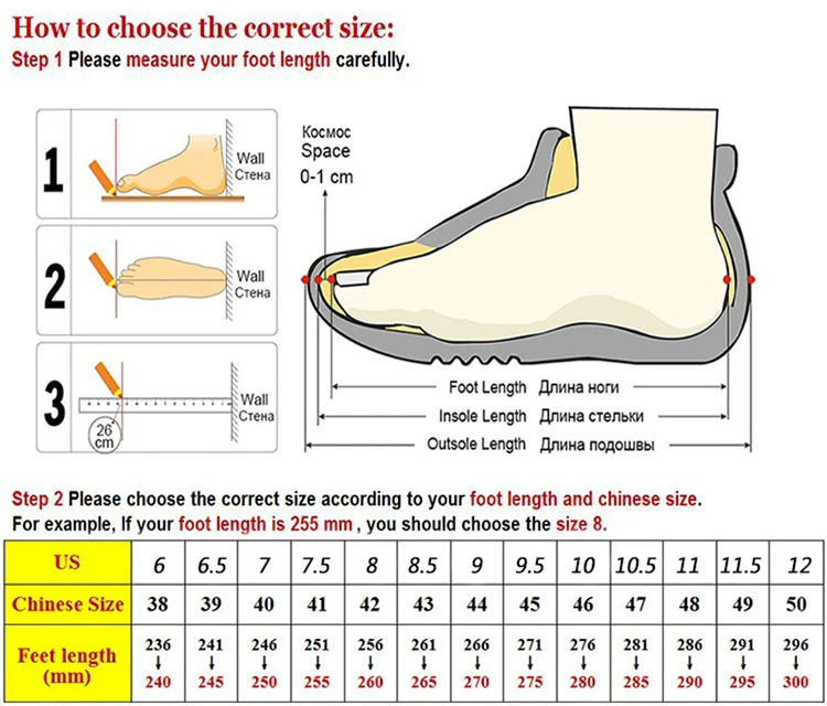 1.100% новый бренд 2. Пожалуйста, выбирайте размер в соответствии с длиной стопы (Не выбирайте размер в соответствии с обычным размером вашей страны!) 3. (Не реальный размер США) просто изменяется с китайского размера в соответствии с нашими правилами. На обуви указан соответствующий размер CN или длина стопы. 4. Примечание: обычно в заказе нет обувной коробки, только пара обуви. Но если вам нужна коробка, пожалуйста, свяжитесь с нами, чтобы увеличить цену, коробка для обуви стоит $5. 5. Из-за разных углов отображения и съемки цвет может немного отличаться от фактического 6. Длина стопы является единственным критерием для покупателя, чтобы выбрать правильный размер. Измерьте длину вашей стопы, как показано ниже 7. Возможны отклонения в 0-50 пикселей из-за ручного измерения.
