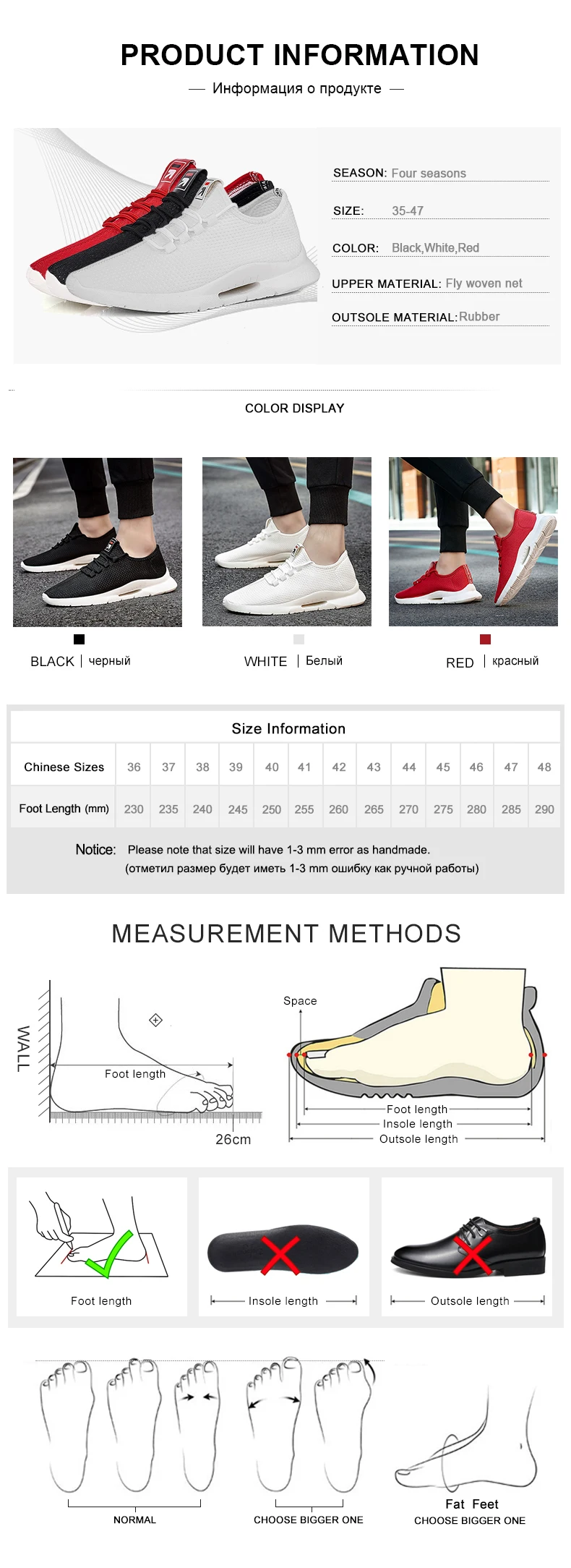 Тип: Мужская Демисезонная обувь; Мужская обувь на плоской подошве; Брендовая мужская обувь; Мужские кроссовки; Повседневная обувь Размер: 35-47 Цвета: черный, Белый, Красный Материал верха: сетка Новое поступление; Мужская обувь на плоской подошве; Мягкие, цветные кроссовки; Повседневная обувь; Новый дизайн; Дышащая обувь Удобные, модные, большие размеры.
